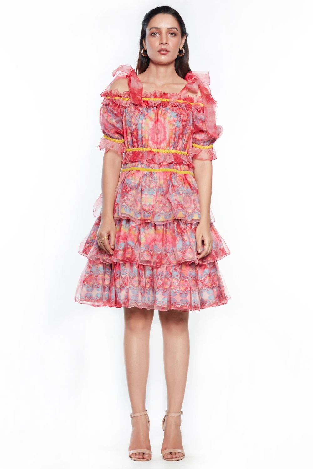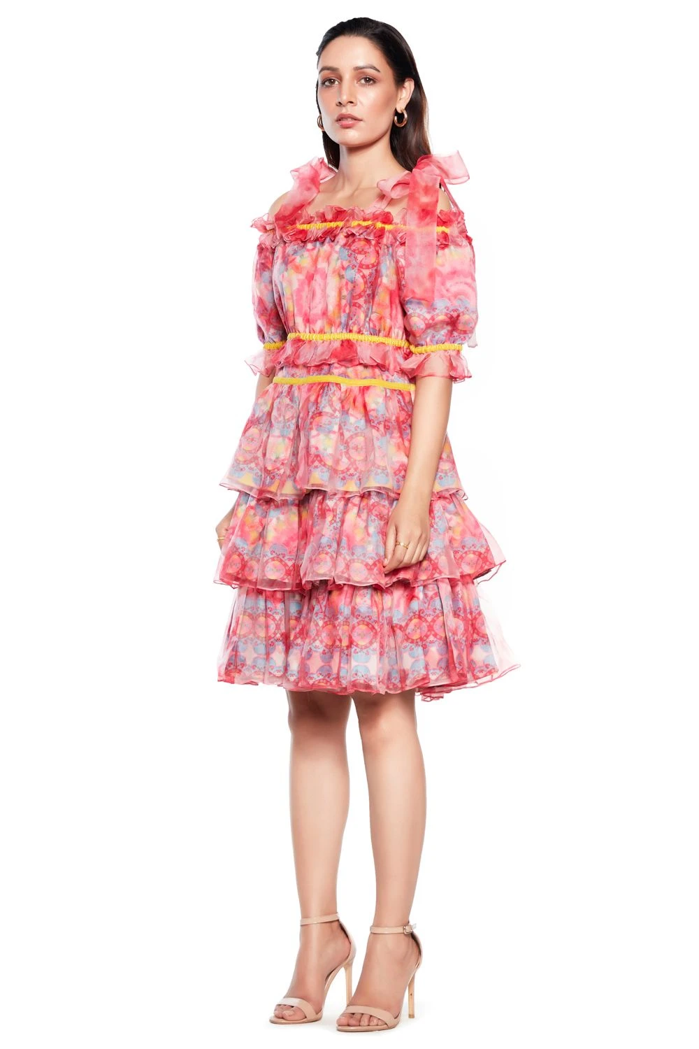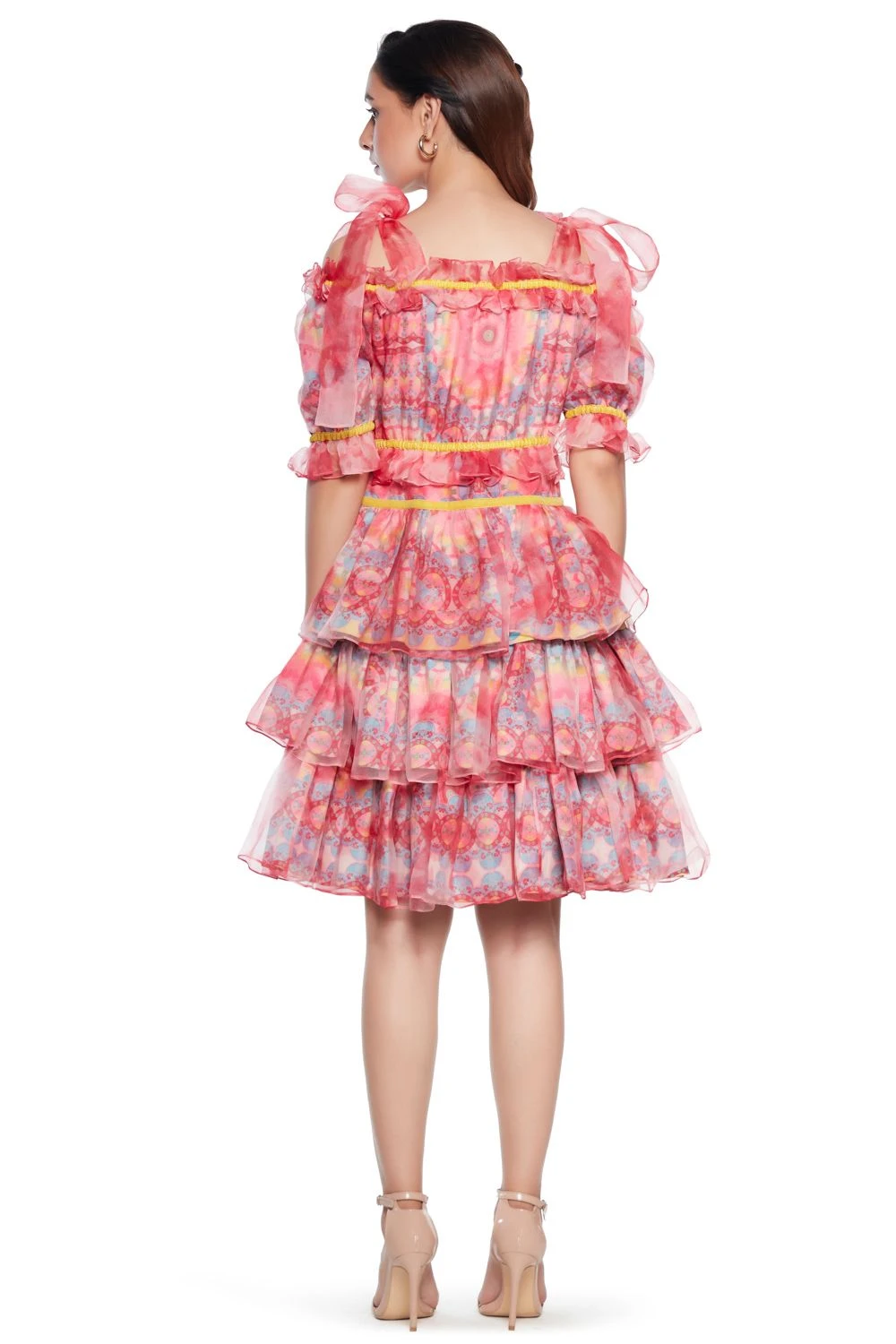 This light pink baby doll dress is all things playful & fun. It is made in moss crepe & organza & printed in eclectic marble prints. Style it with a pair of hoops for a summer soiree.