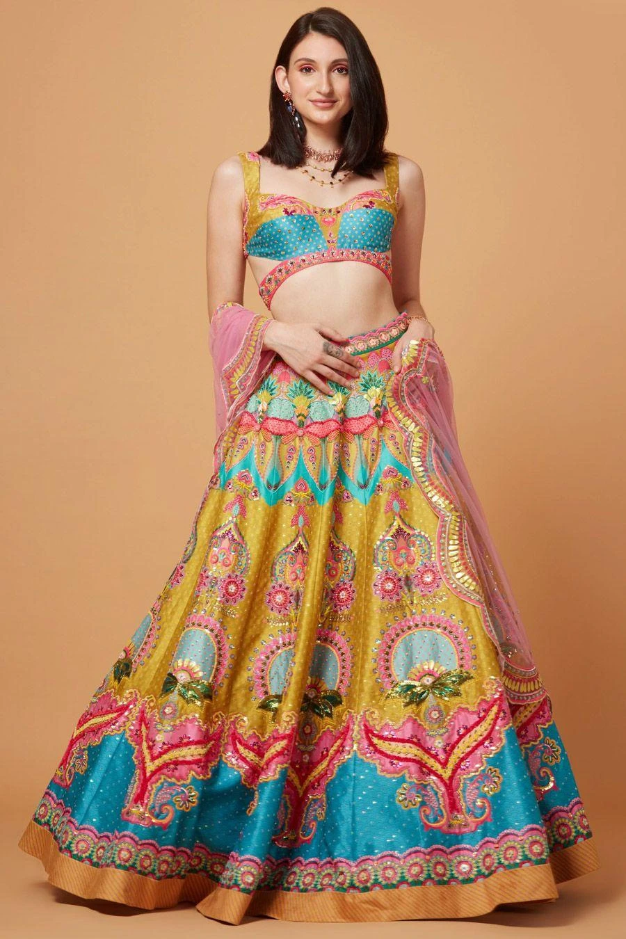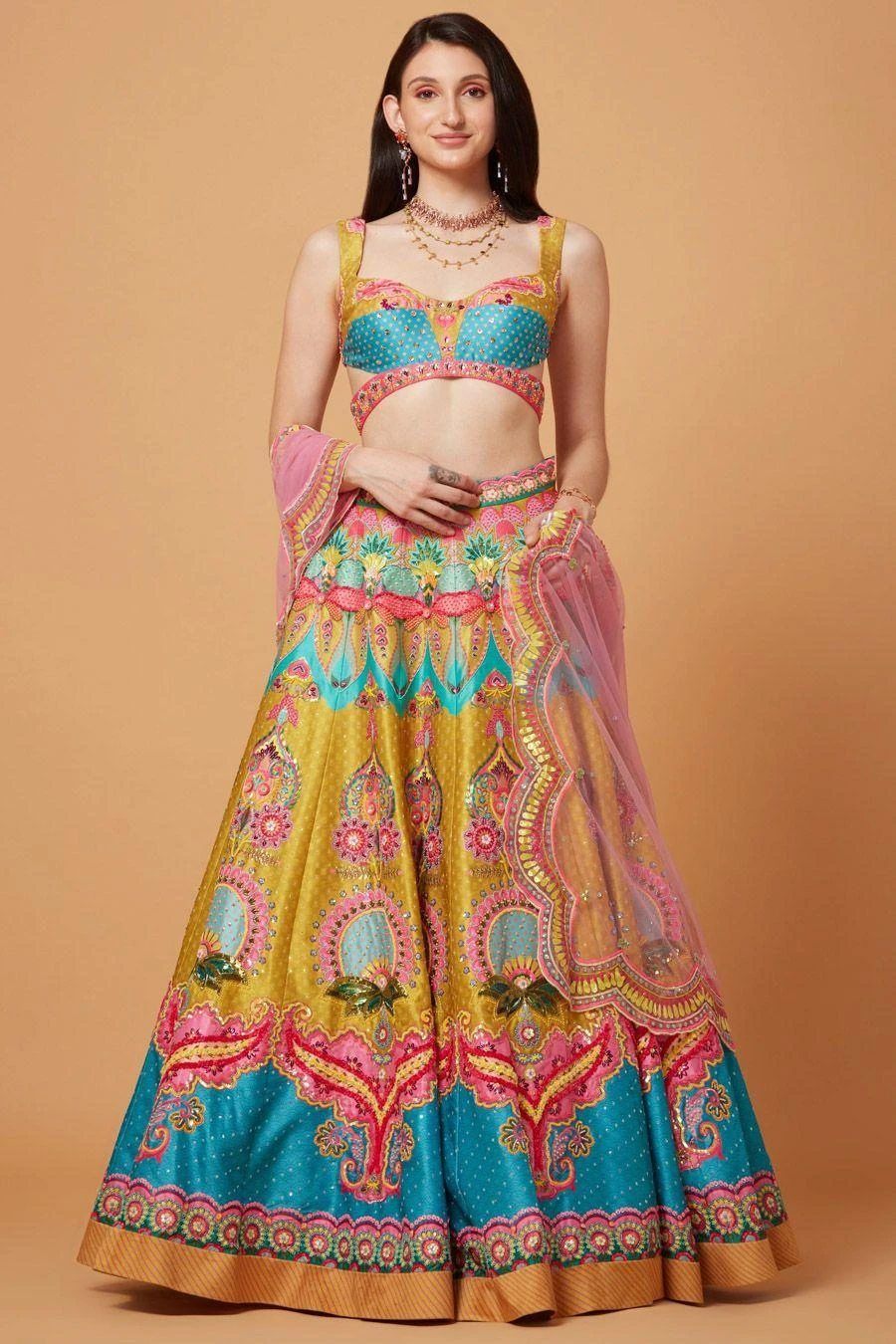 This lehenga set will see you through all kinds of celebrations this festive season. Crafted in dupion and net, this set features a hand embellished blouse paired with a lehenga and dupatta. Add a pair of statement earrings to complete the look.