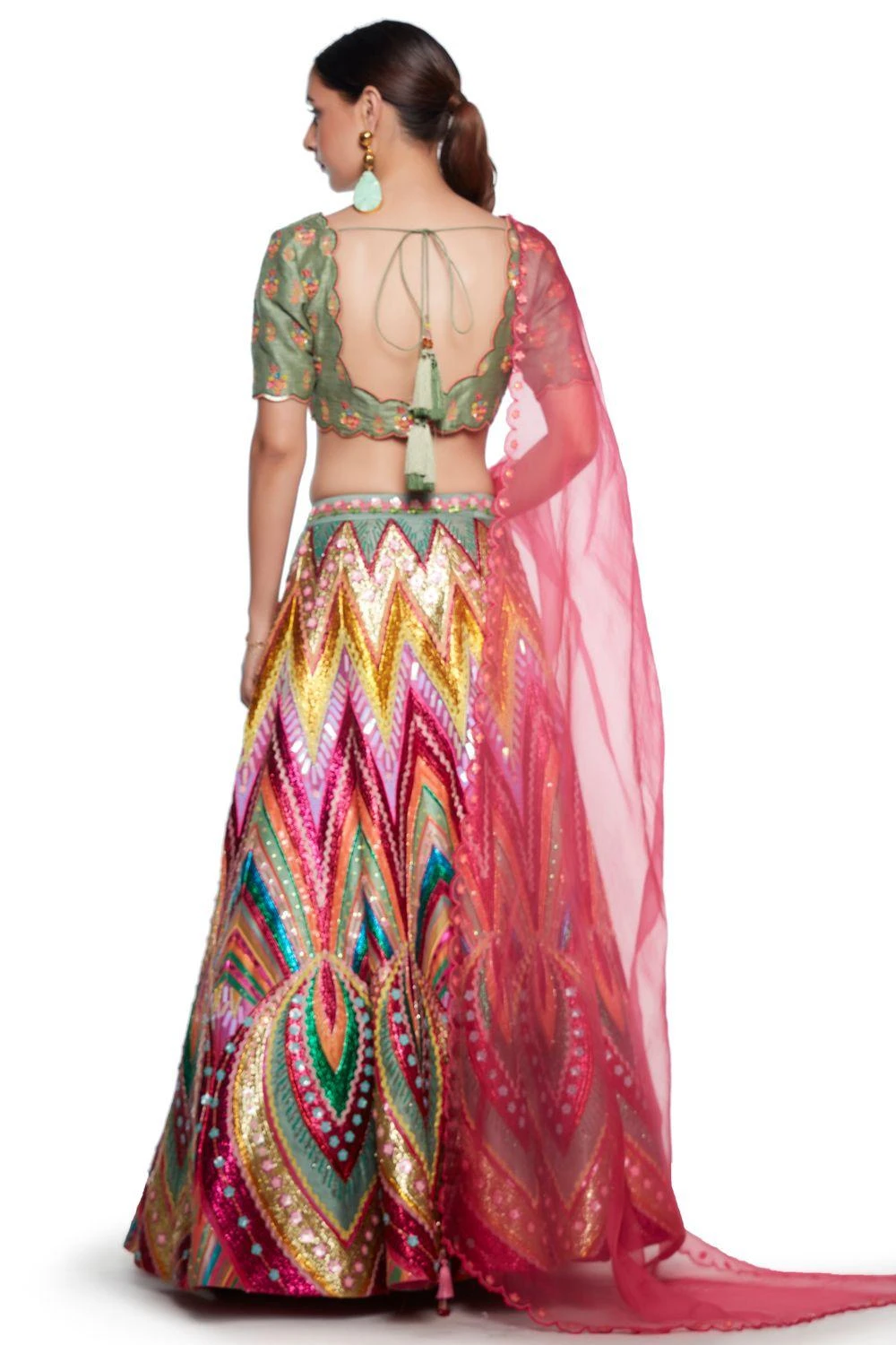 Ace your bridesmaid look in this electric & eclectic multi-coloured chevron lehenga set. The lehenga is made in raw silk and accented with colour waves & embroidery. It is paired with a green scalping embroidered blouse & organza dupatta.