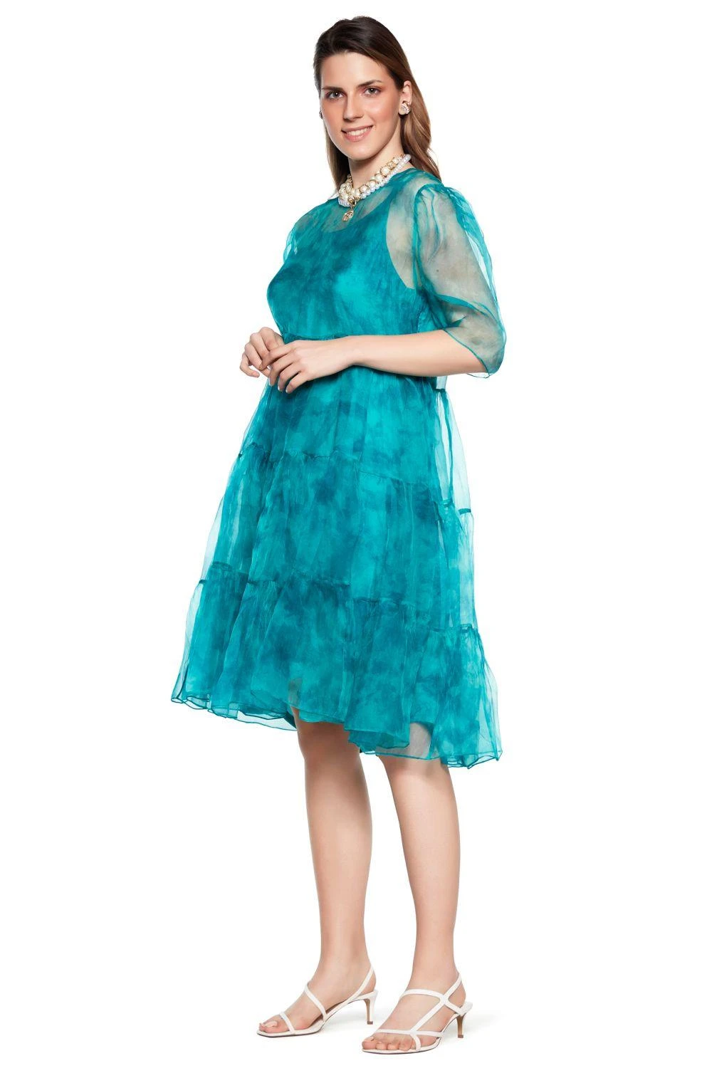 This turquoise tiered dress has the perfect amount of glam & softness. It is cut in luxe organza and printed in an eclectic tie & dye. It comes with a soft pure satin slip. Style it with a pair of statement earrings for a daytime soiree.