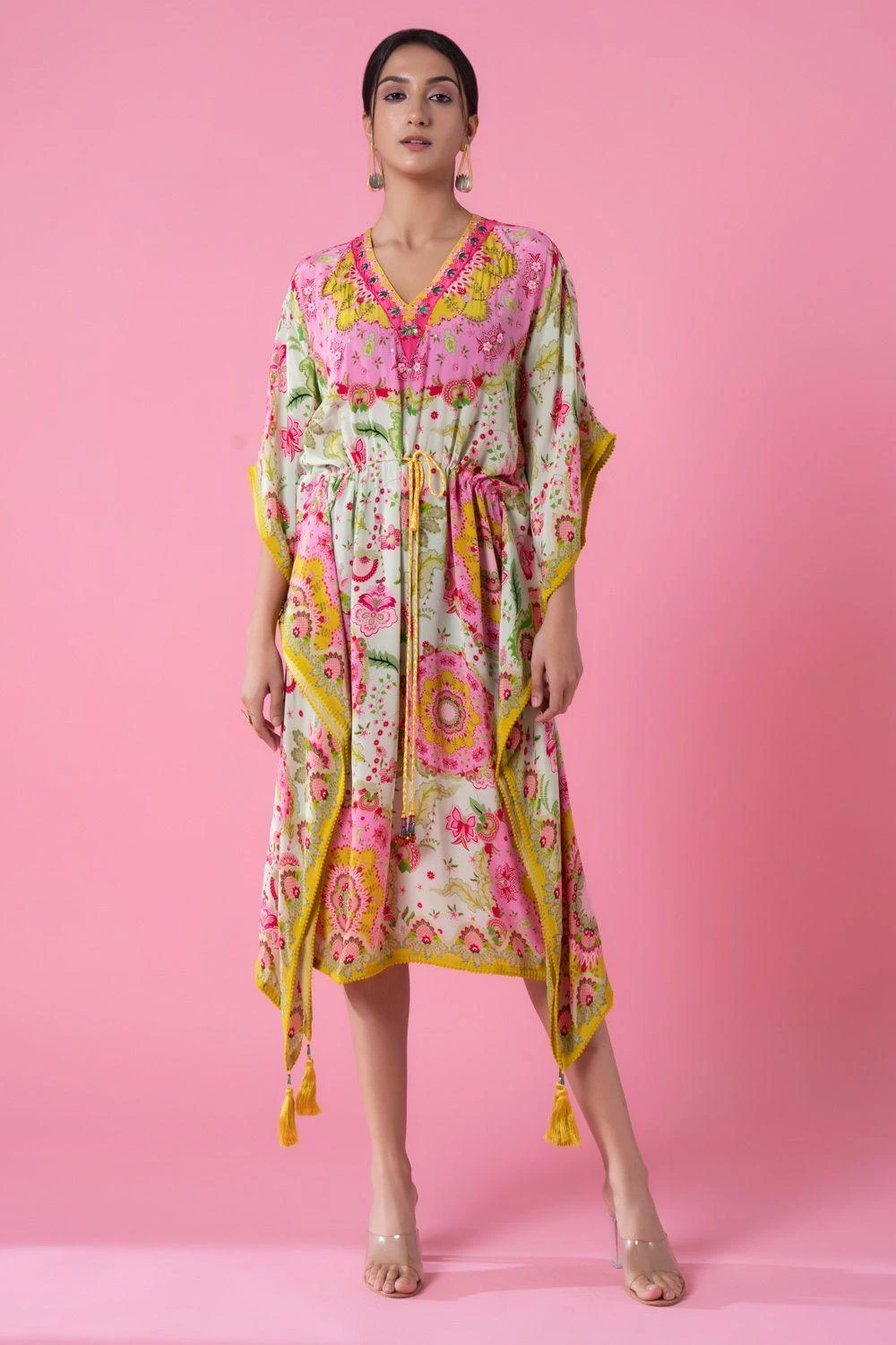 Elevate allure with this opulent floral printed kaftan, adorned with embroidery, playful pom-poms & a tie-up lace detail. Perfect for elite soirÃ’es, style with jewelry for a chic & luxurious statement. Redefine elegance, make every moment exquisite.