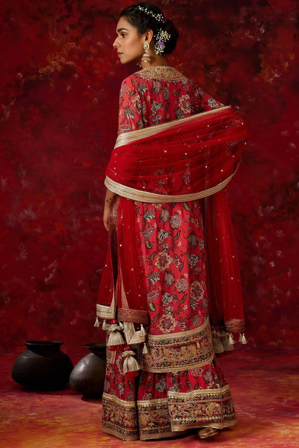 This set will see you through all kinds of celebrations this festive season. It comes with a long chintz printed georgette kurta with intricate sequin work & a neckline with thread & dori embroidery paired with a sharara & an embroidered dupatta.