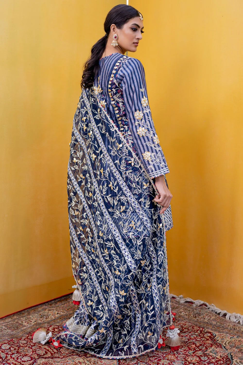 Get festive ready in this blue ornate sharara set. It features a chanderi benarasi kurta, paired with matching sharara and an organza dupatta. Style it with a pair of jhumkas and a potli bag.