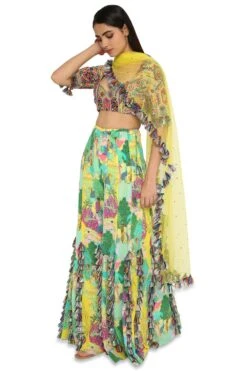 This classic ivory sharara set is a must have in one’s festive wardrobe. It features a thread embroidered jacket highlighted with brocade chevrons & tassels, paired with a delicate organza sharara and a gota bustier.