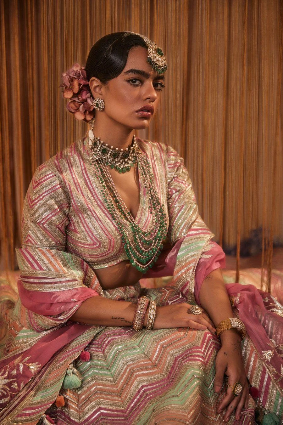Add this ethereal ensemble to your wedding trousseau for an elegant bridal look. Crafted in chanderi, this set comes with a heavily embellished gota striped lehenga with an equally versatile blouse & an organza dupatta with a wide gota border.