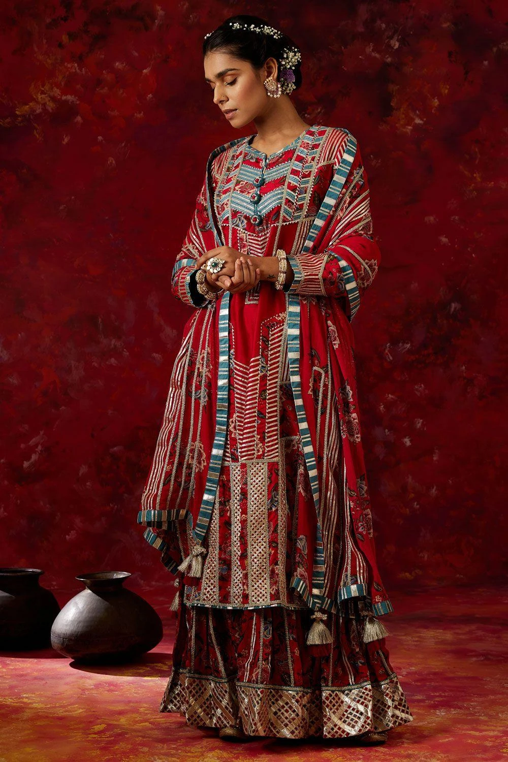 This sharara set will see you through all kinds of celebrations this festive season. It comes with a digitally printed chanderi & contrasting patchworked kurta paired with an embellished gota stripes sharara and a georgette printed dupatta.