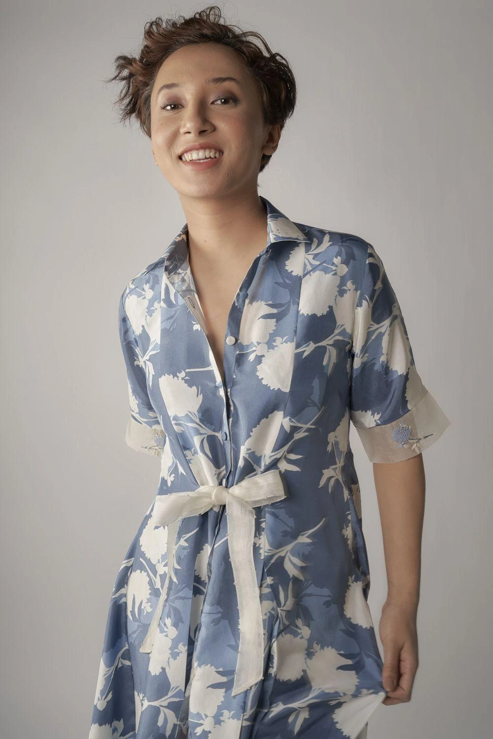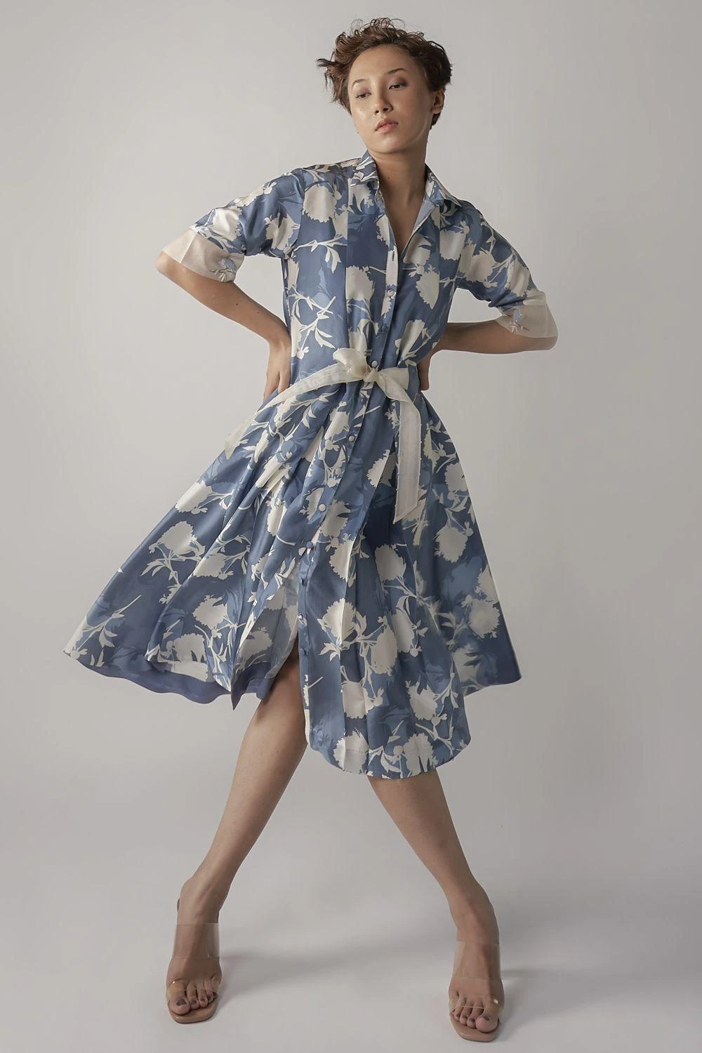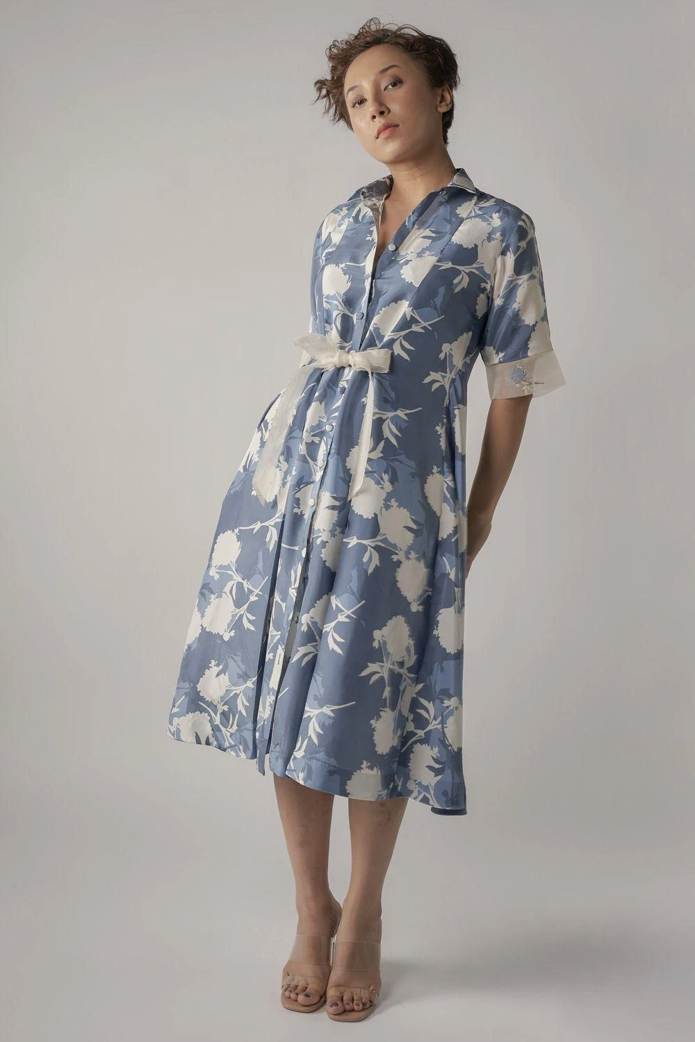 This floral blue midi shirt dress is a harbinger of the spring season. It is cut in sumptuous silk fabric with a front tie-up detail and features embroidery details on the sleeve hem. Dress it up with a pair of kitten heels & hoops.