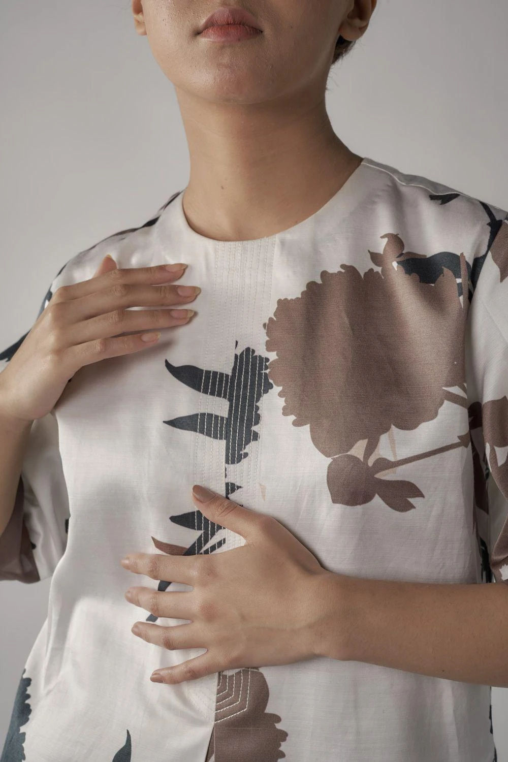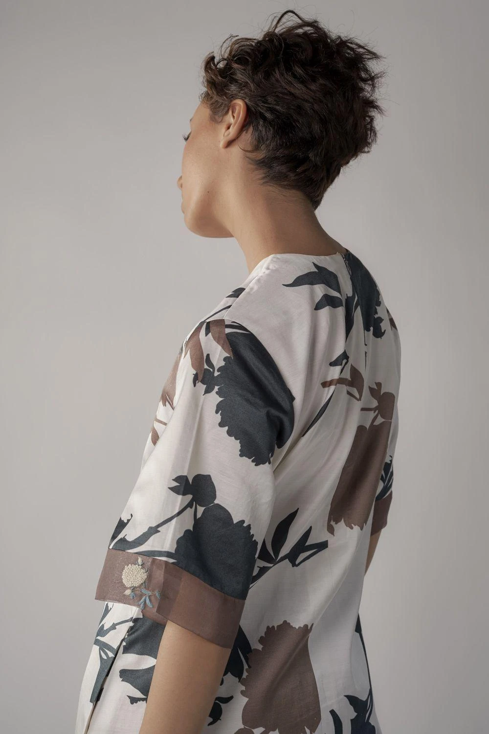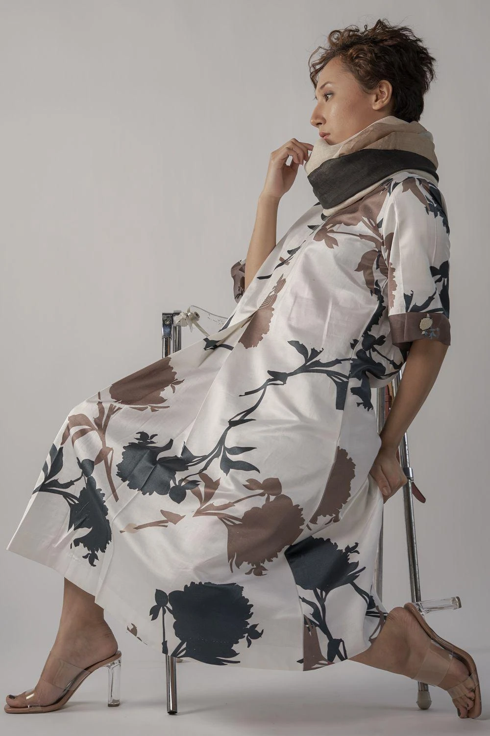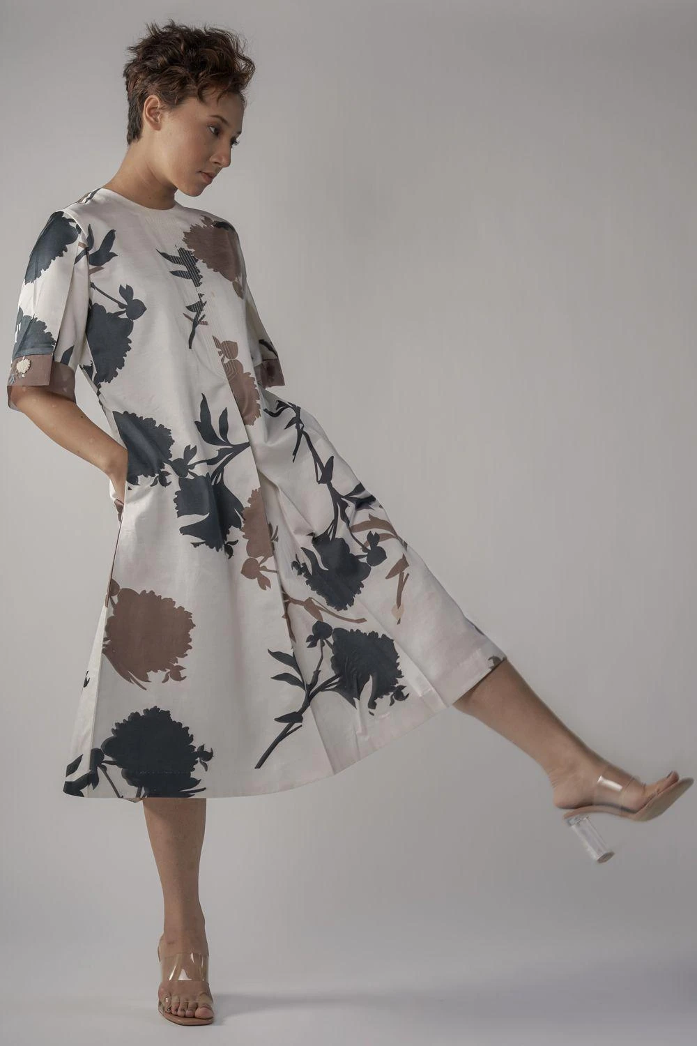 Soothing hues & relaxed silhouettes are what you need to amp up your closet for the upcoming season. This white & grey structured dress is cut in 100% cotton silk with big floral print.
