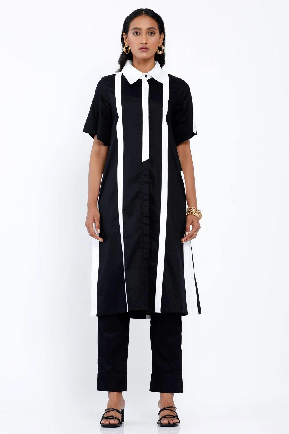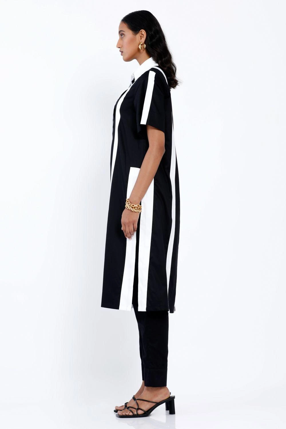 This long striped shirt dress is set in a premium cotton fabric. The contrast collar & linear bands add a stylish edge to this classic piece. Style this dress with understated accessories for a casual & chic look.