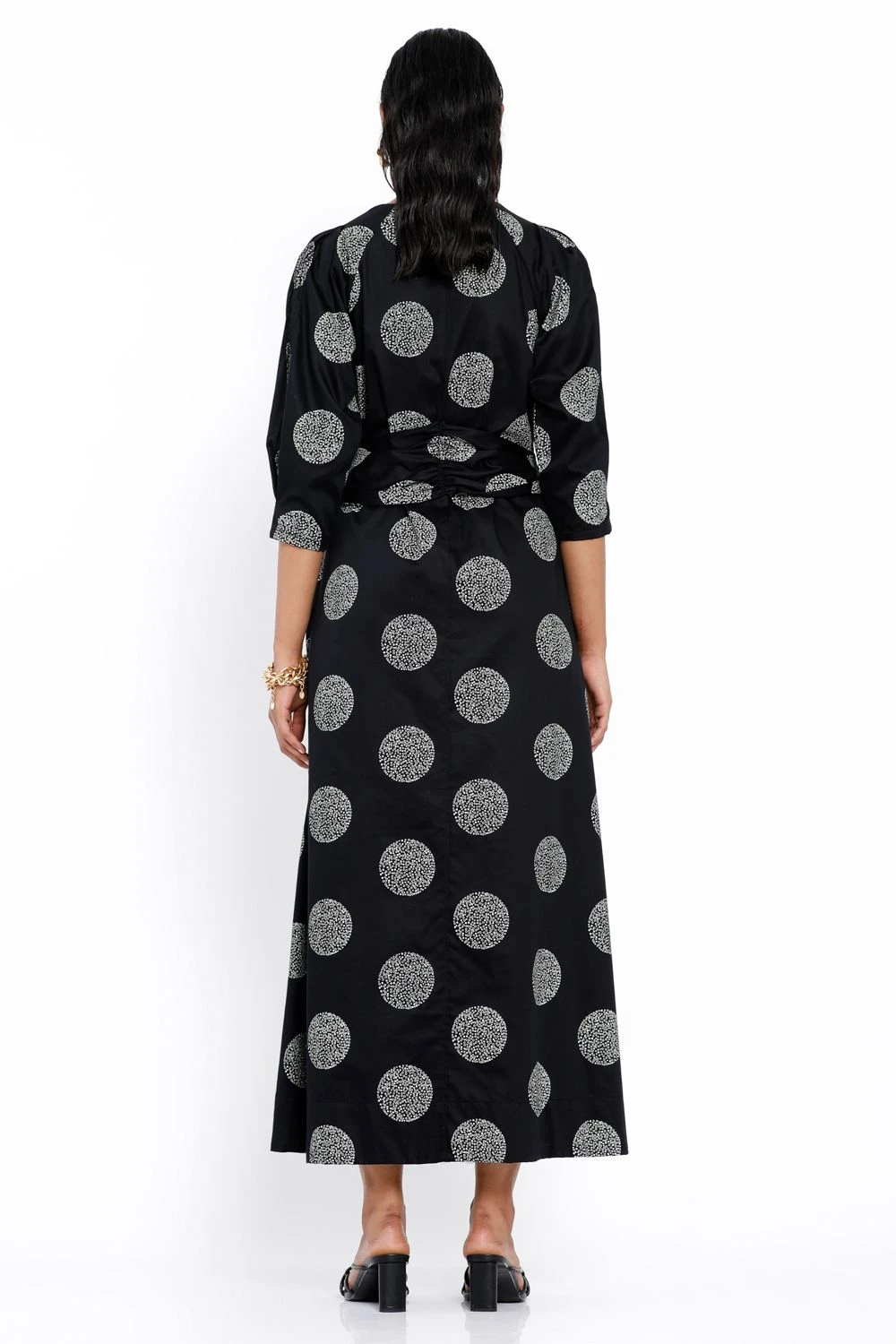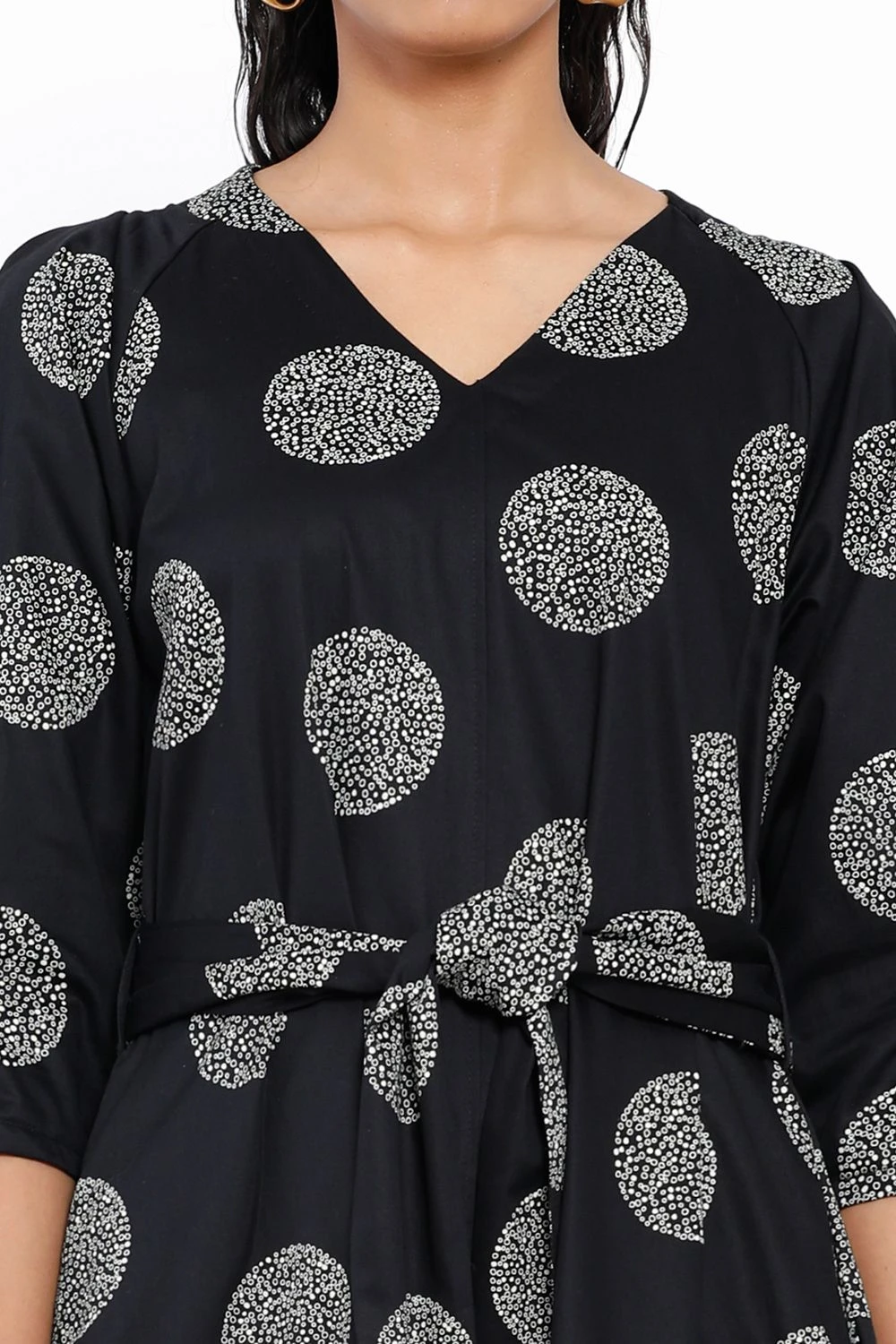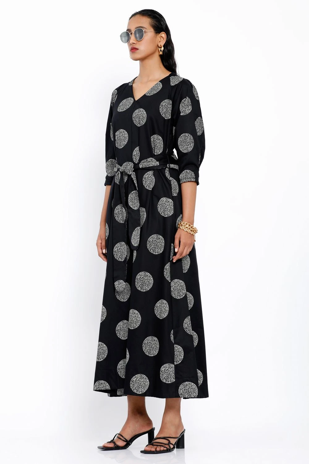 This black V neck maxi dress has a polka dotted floral print. This chic piece is perfect for casual daytime events. Style this piece with statement earrings & a colourful handbag for an effortlessly stylish look.