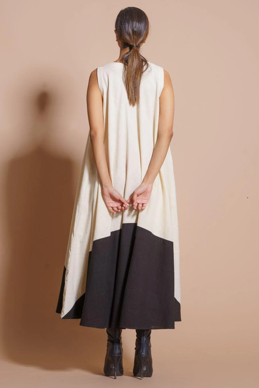 From your work desk to the brunch table & from lounging at home to catching flights, you can always count on this dress. Crafted in khadi cotton, this V-neck, circular dress features colour block details.