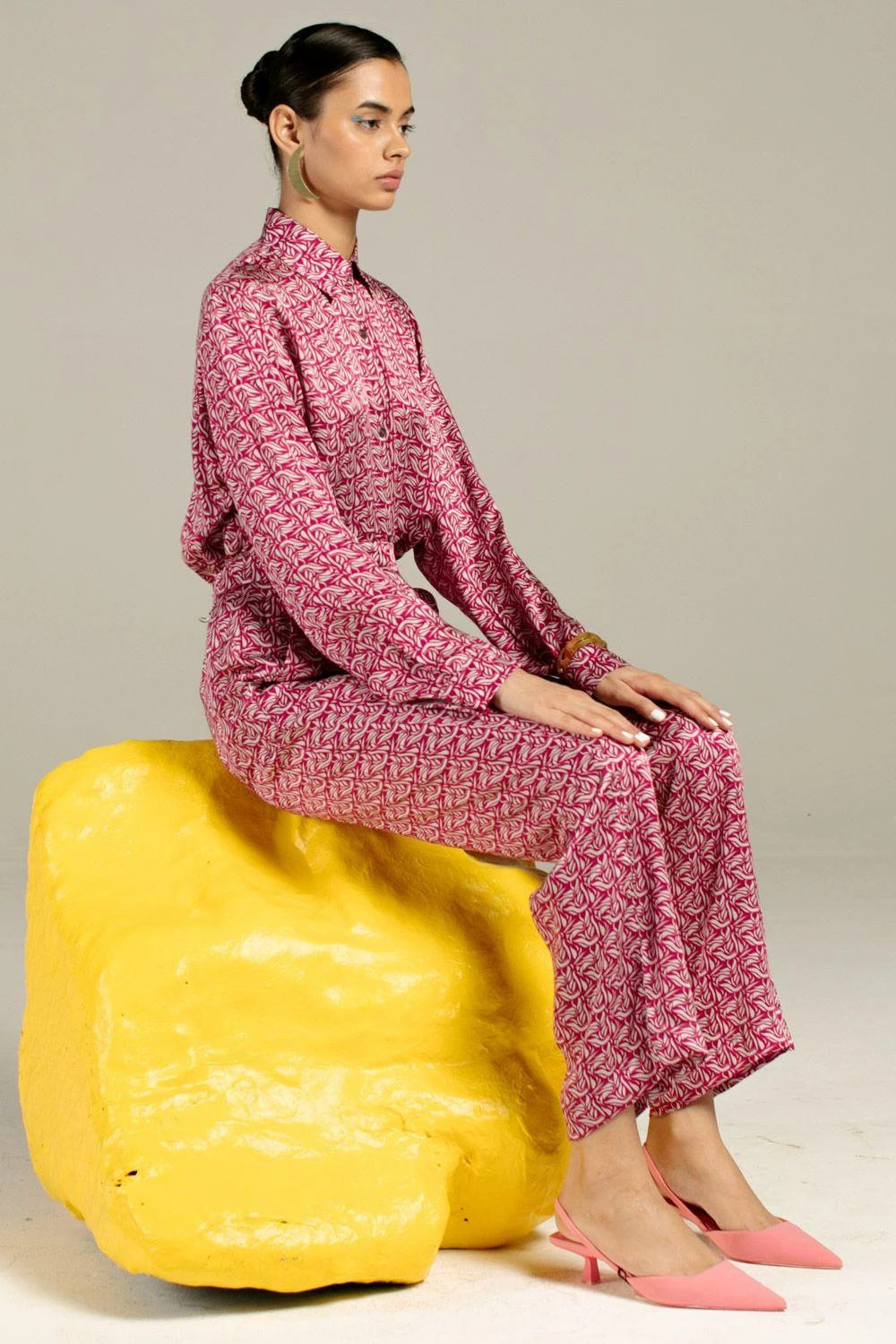 Update your everyday closet with this opulent rose pink shirt. It is mindfully cut in soft vegan silk enhanced with digital azulik print. You can style it with a pair of coordinating pants for a sophisticated look.