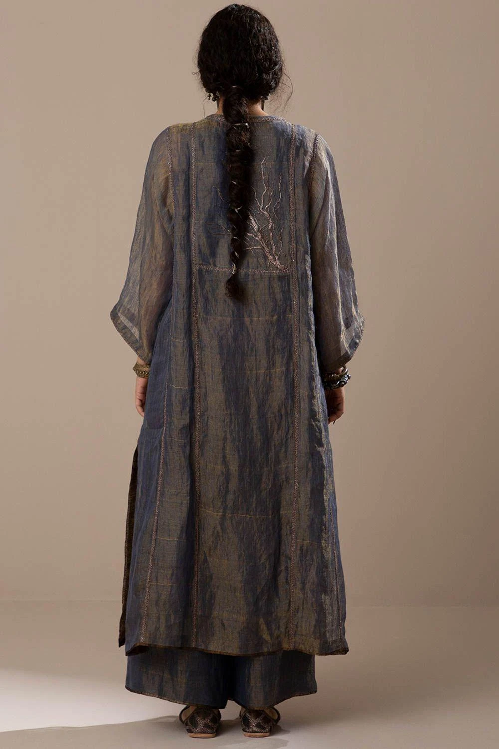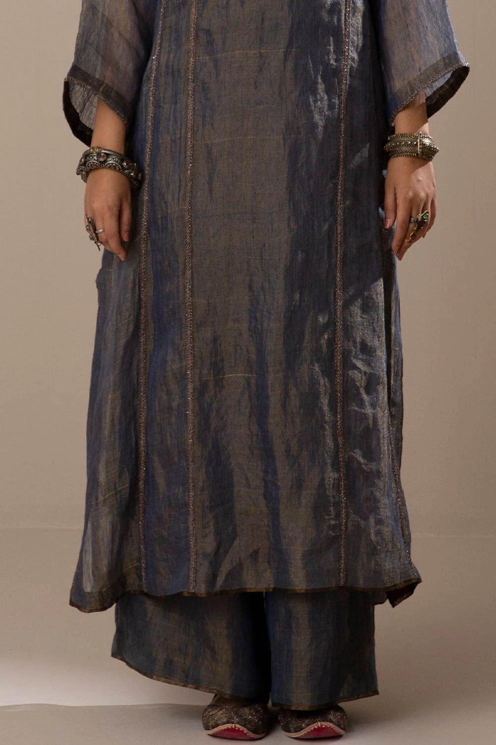 These pants, made of raw textured linen Zari handwoven textile have front side seam pockets and an elasticated back with front drawstrings. The monochrome antique nimzari & tilla dori embroidery adds a touch of glam to these pants.