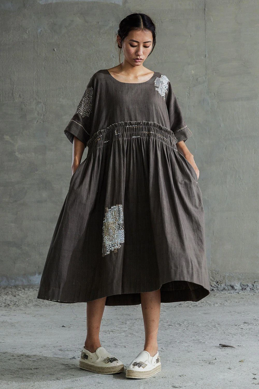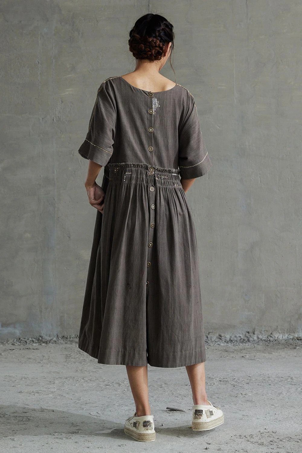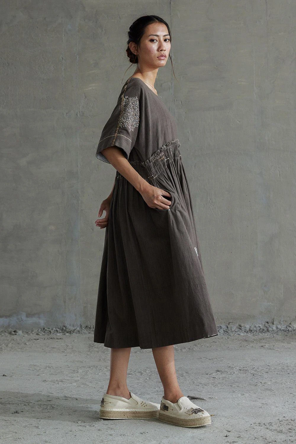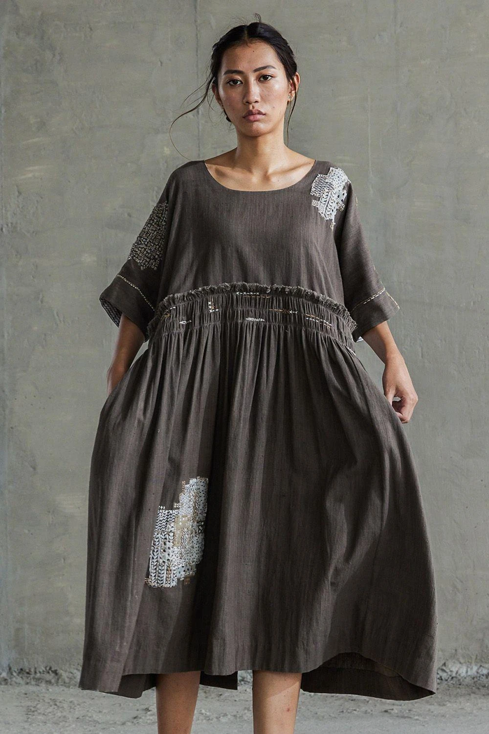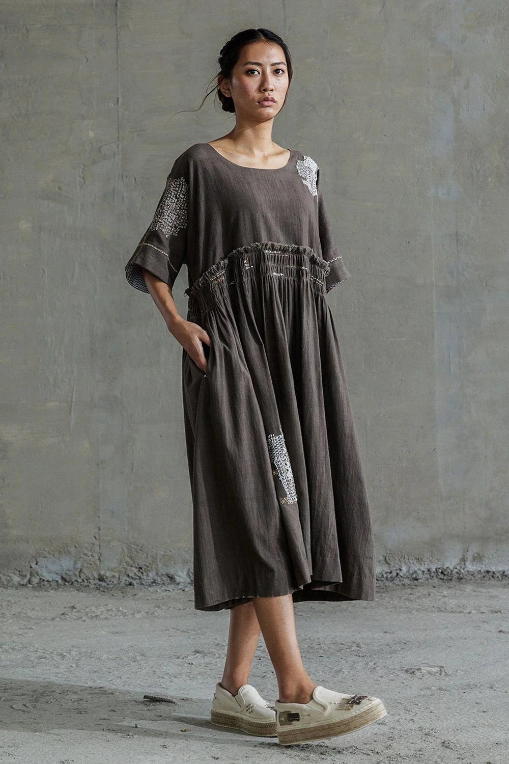 This dress made in handspun cotton comes with kimono-inspired sleeves, back full button-down closure and side seam pockets. It features ruched gathers on the waist and frayed edging. The dress has boro style patchwork and sashiko stitch accents.