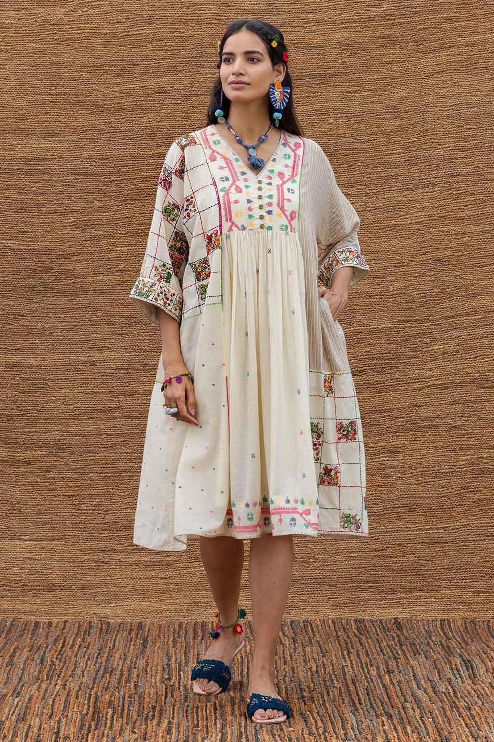 This easy slip on jamdani muslin dress is what you need on a balmy summer day. It has a front & back gathered yoke with dropped shoulders, fetching comfort. The floral thread embroidery adds grace to this piece.