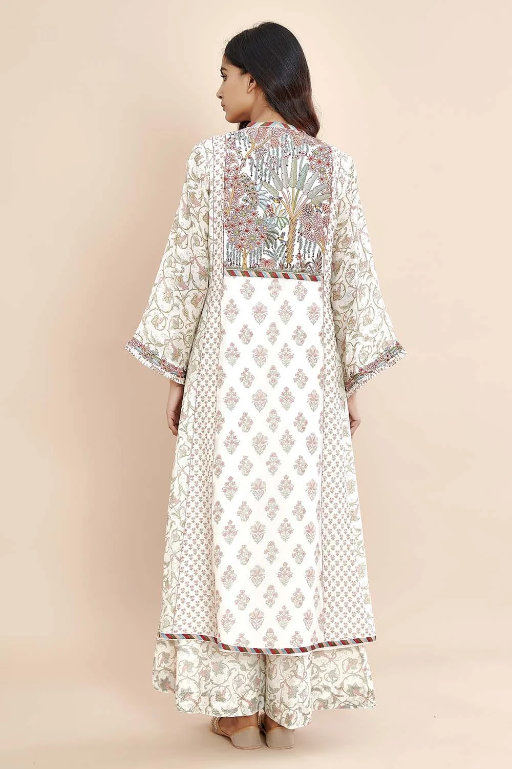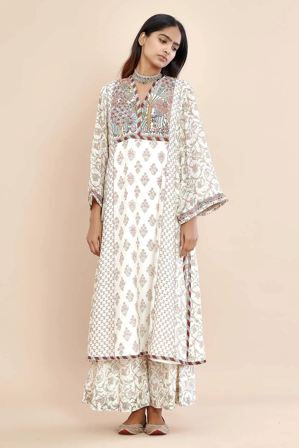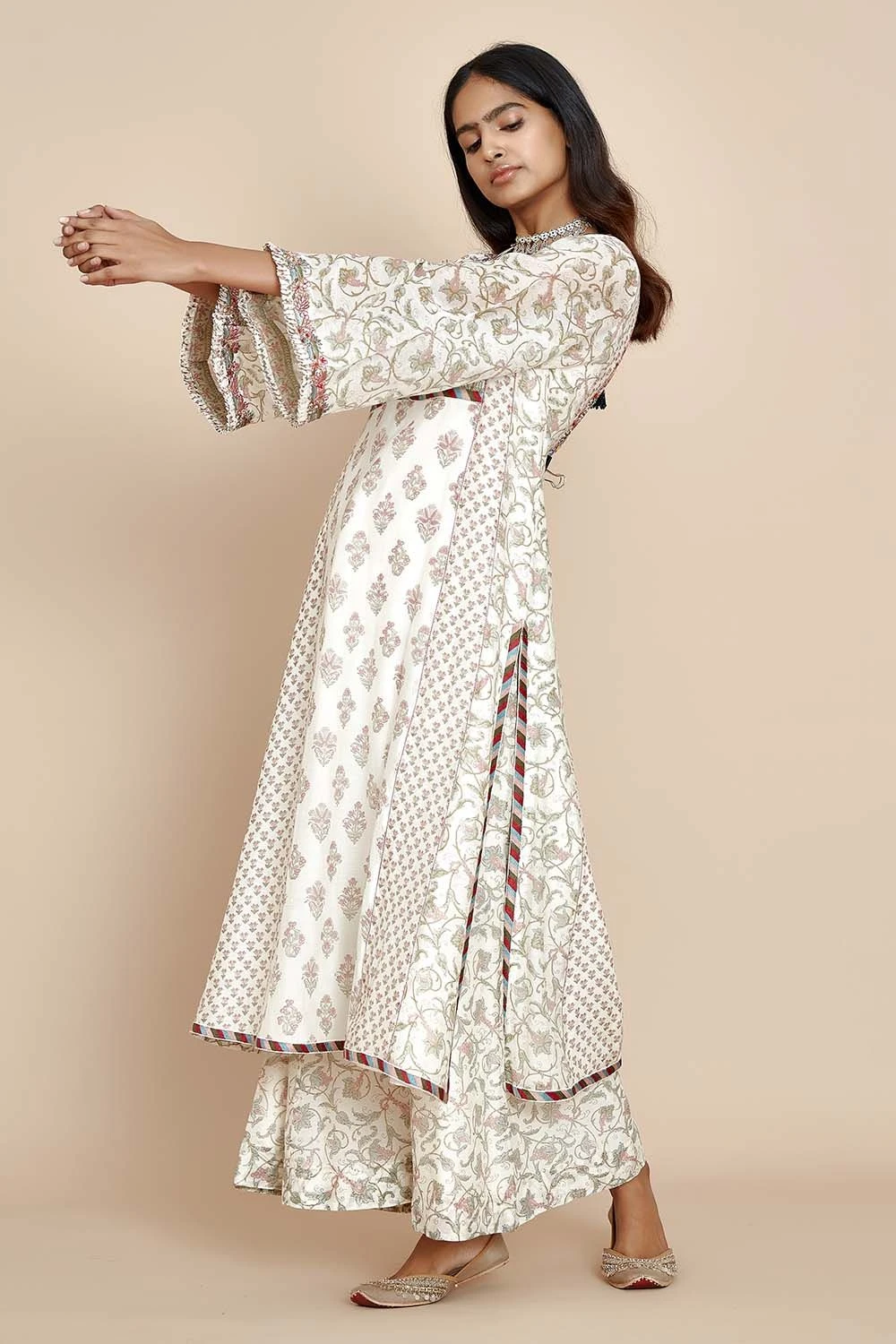 A relaxed and breathable panelled Ijar pant, features an interplay of floral chanderi hand block prints and pastel hues. Pair it with the panelled kurta and lehriya dupatta from the collection. Summer is already looking good.