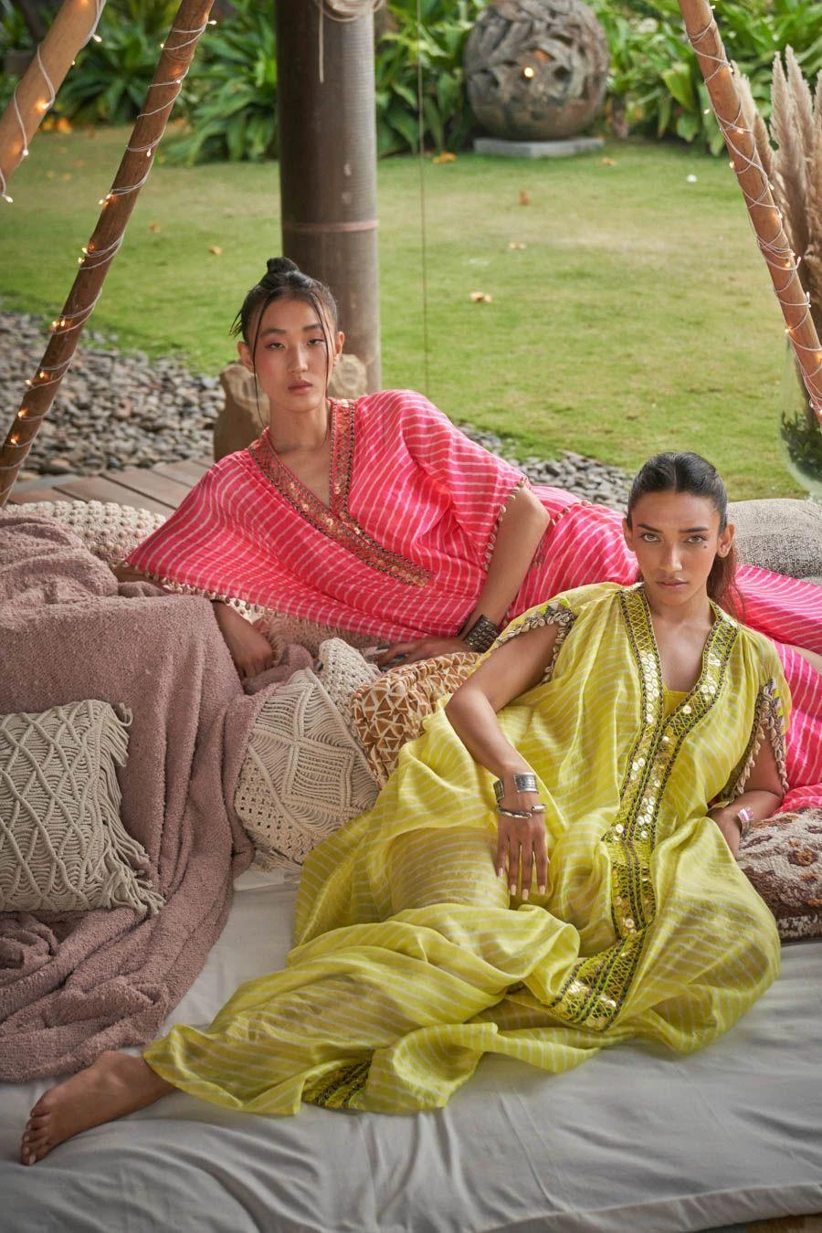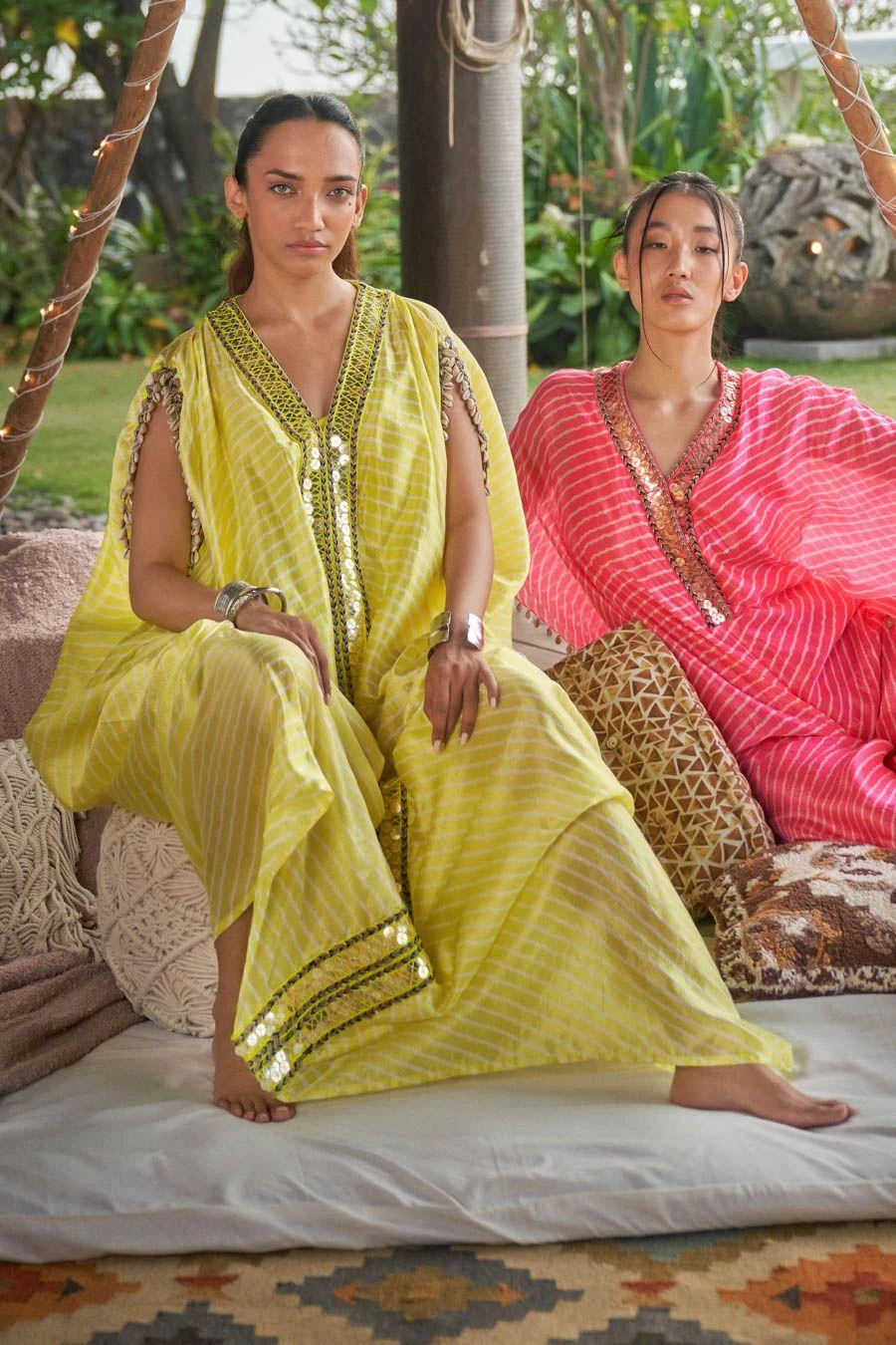 Look effortlessly stylish with this neon yellow embellished kaftan. Crafted with meticulous attention to detail, this radiant piece effortlessly blends vibrant hues with a touch of elegance.
