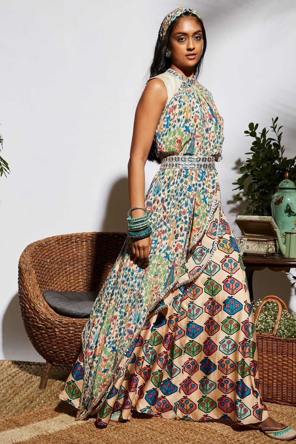 Keep it light & effortless this festive season with this beige printed sharara set. It features a silk crop top with attached drape, paired with printed sharara pants.. Style it with a belt to accentuate your look.