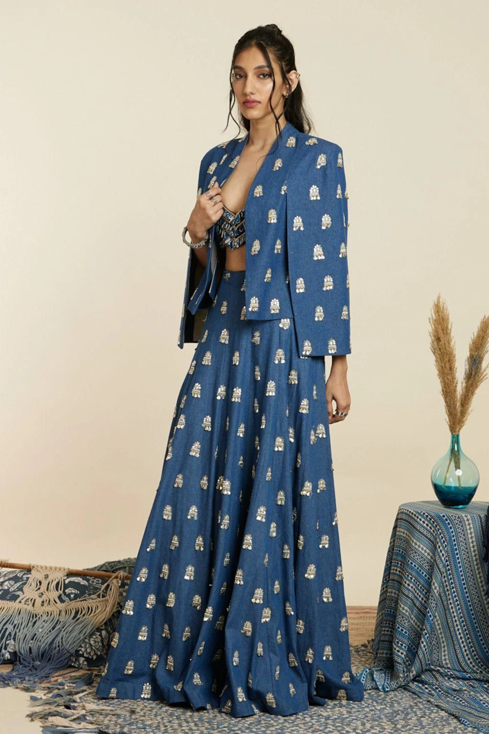 This blue embellished denim lehenga paired with a textured bustier & highlighted jacket is a fusion of edgy elegance. Perfect for fashion events or modern celebrations, it’s a bold choice for trendsetters aiming to stand out at stylish gatherings.