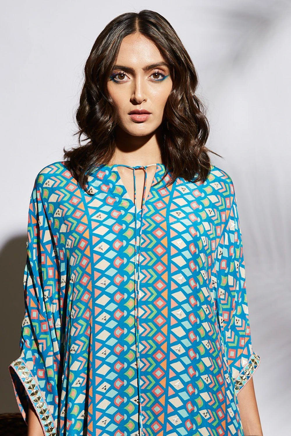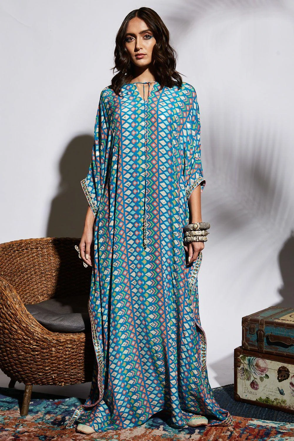 This breezy blue geo print kaftan is a great pick for your vacations. It is cut in sumptuous silk fabric and highlighted with a metal embellished triangle border. You can style it with a pair of breezy danglers and a clutch.