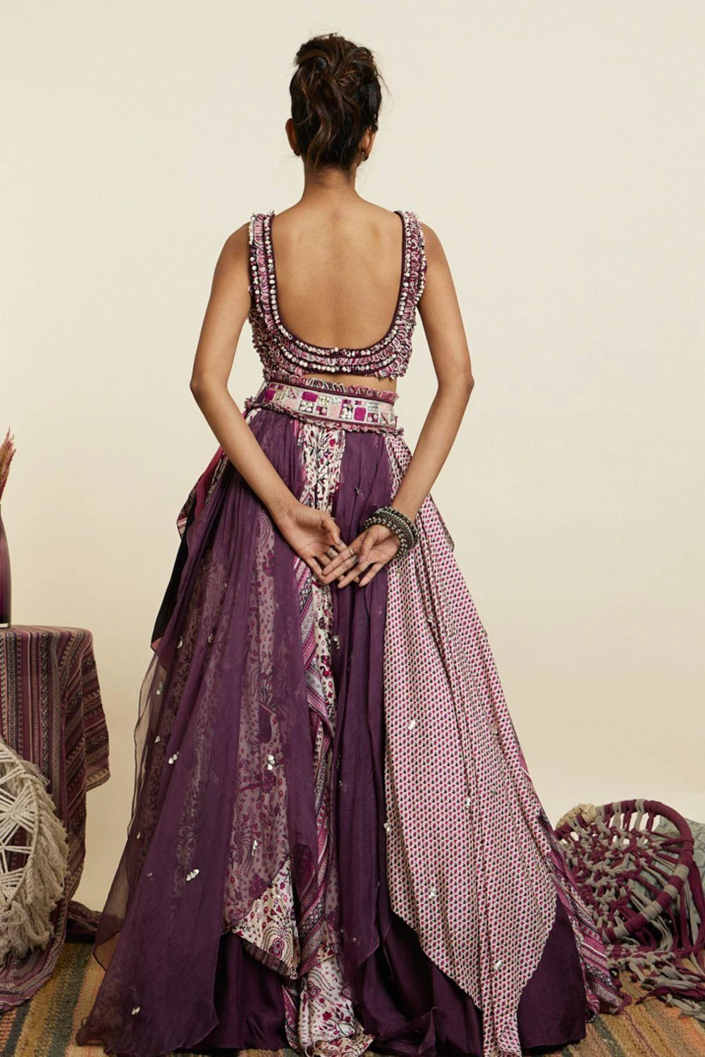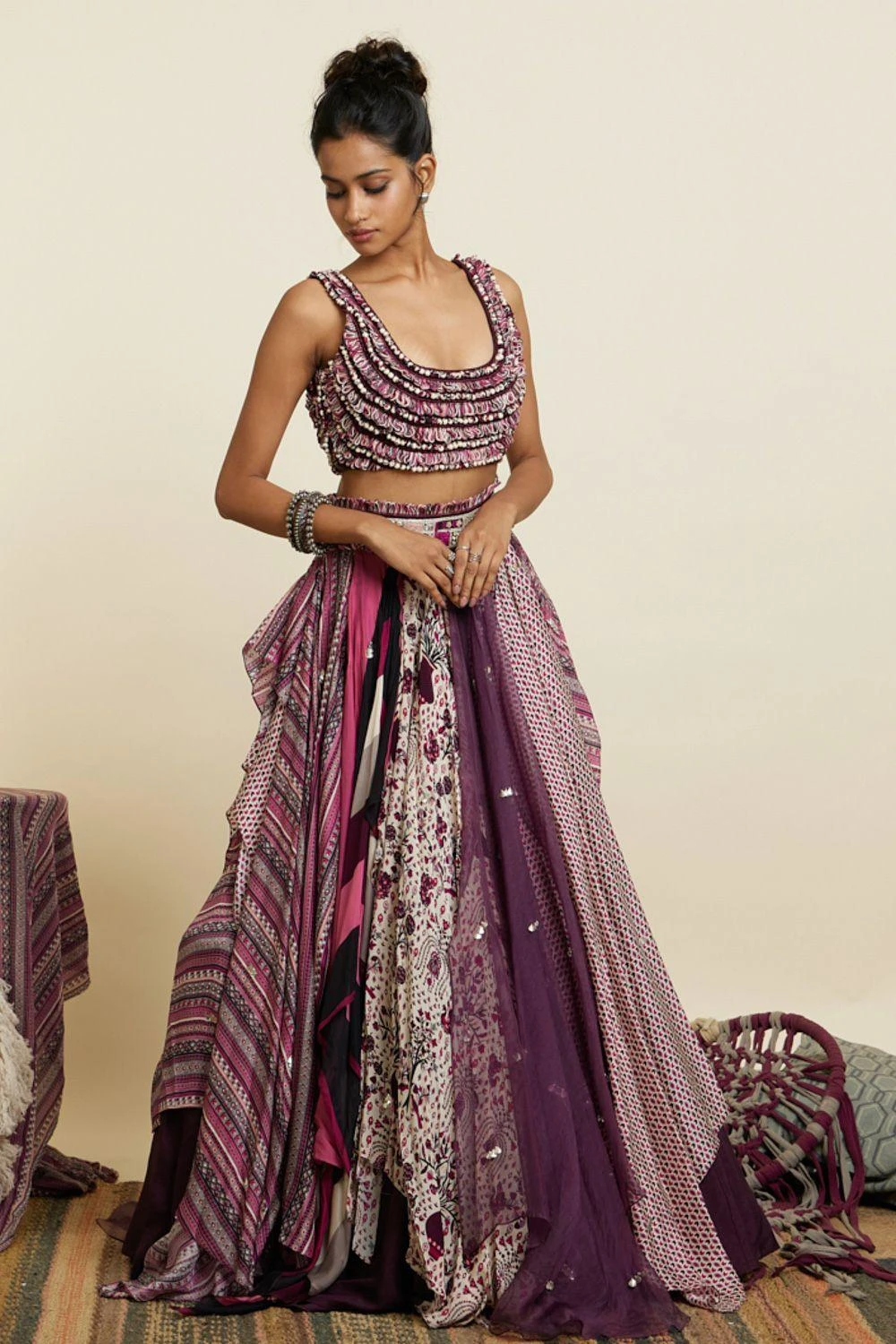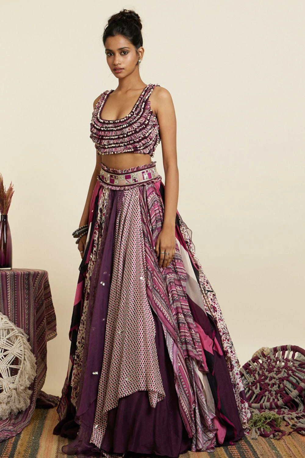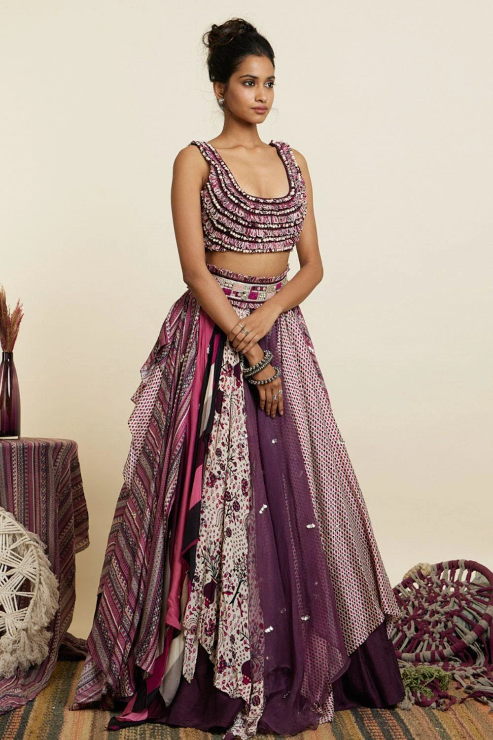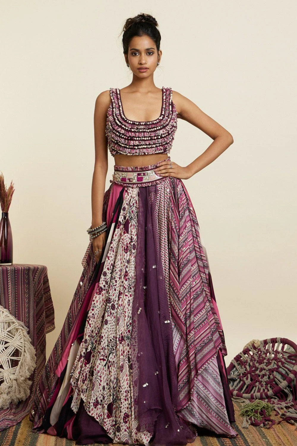 Indulge in elegance with the textured croptop paired with a multi-printed boho inspired skirt in crepe base. Versatile for garden parties & casual outings, it’s a stylish ensemble perfect for brunches, outdoor events, or stylish daytime occasions.