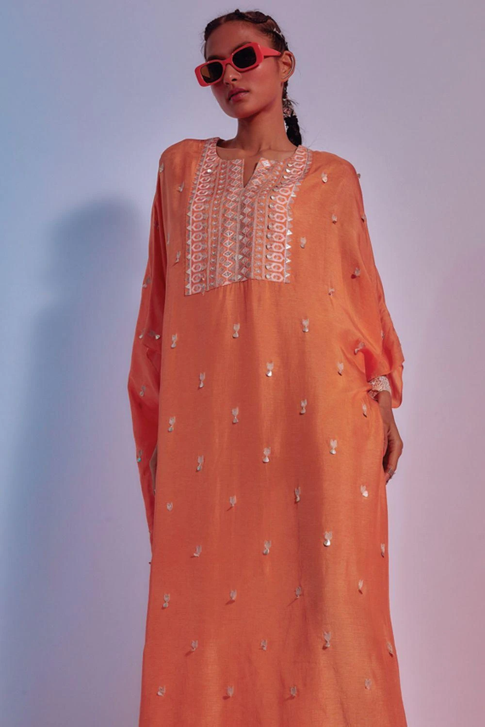 Whether a lunch with the ladies or an intimate festive affair, wear this orange kaftan with equal ease. The kaftan is cut in silk and features an embroidered yoke & buttis all over. You can accessorize it with a statement clutch.
