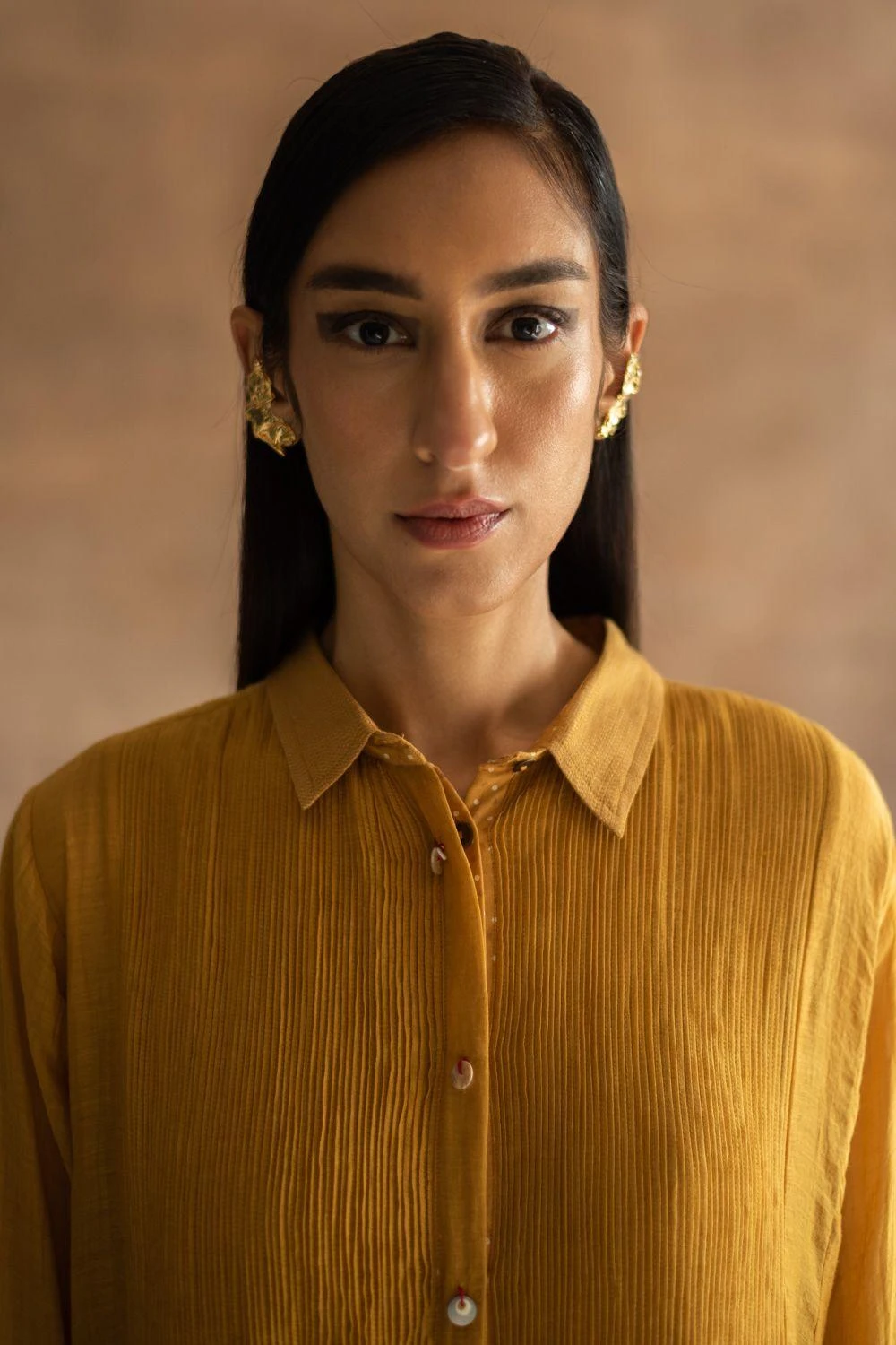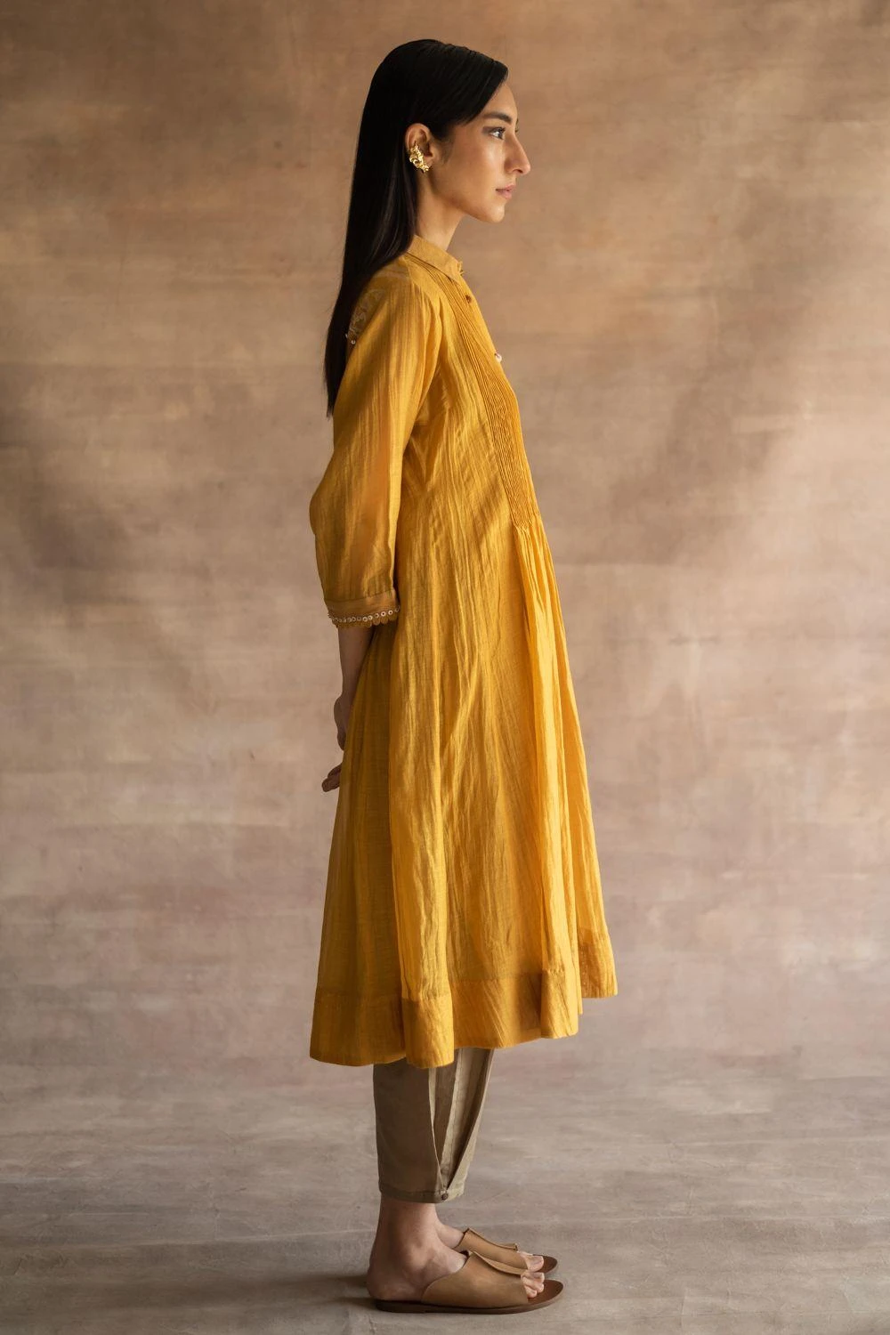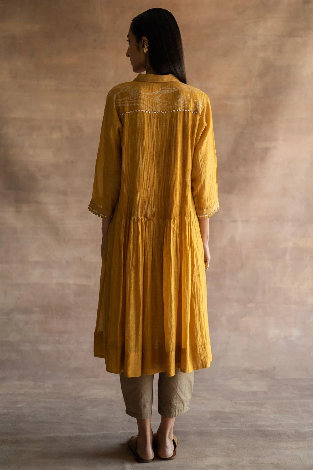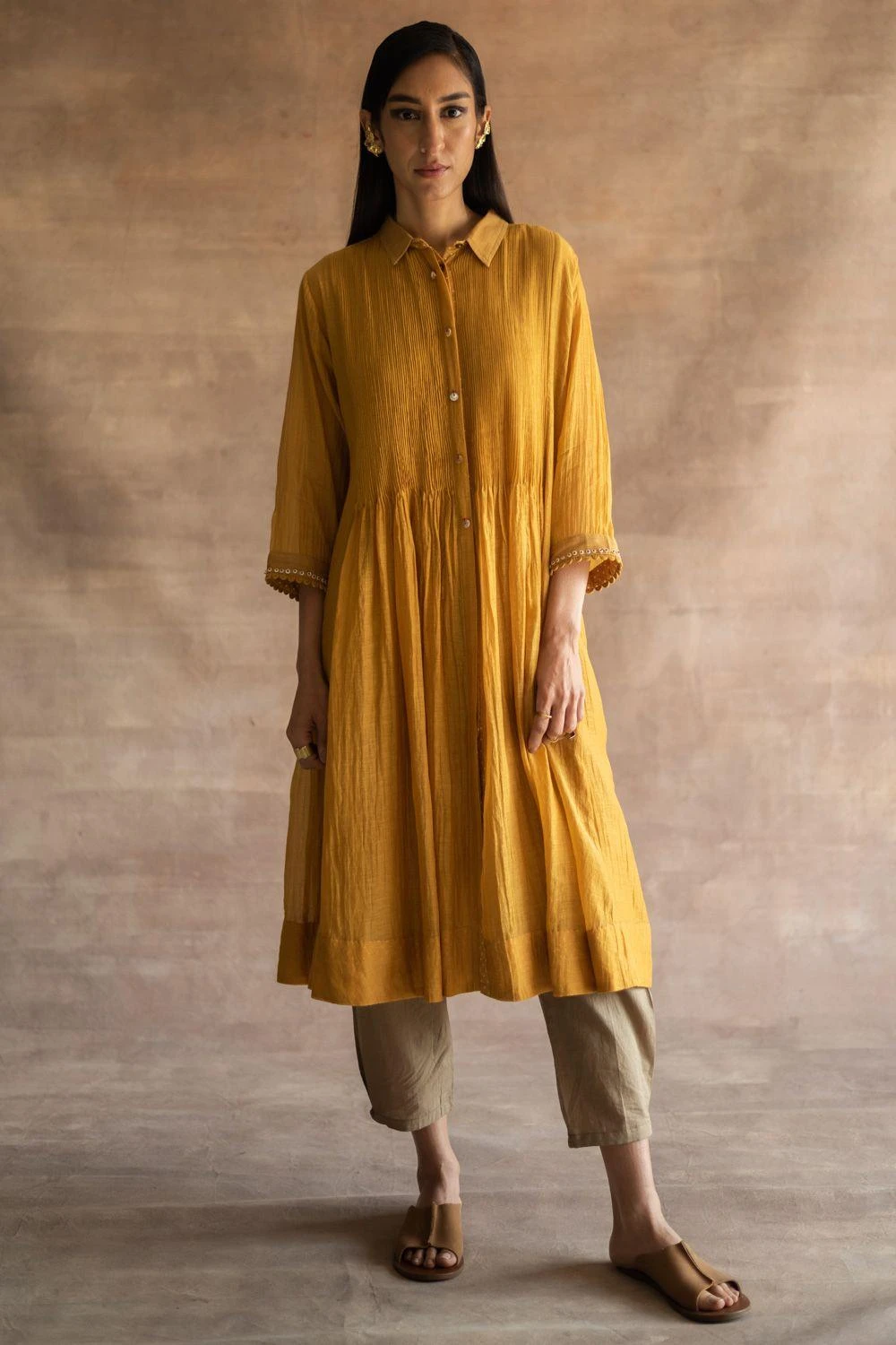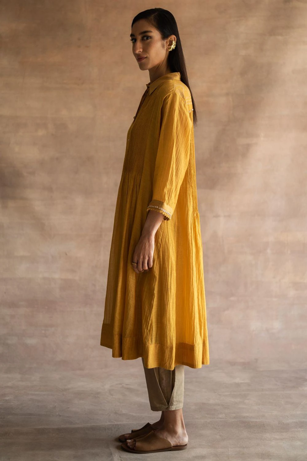 Swati Kapoor’s new line features relaxed silhouettes made of luxe fabrication like this mustard midi dress. It features hand block print at the back yoke, fine pintucks & corded cuffs, finished with Mother of Pearl buttons.