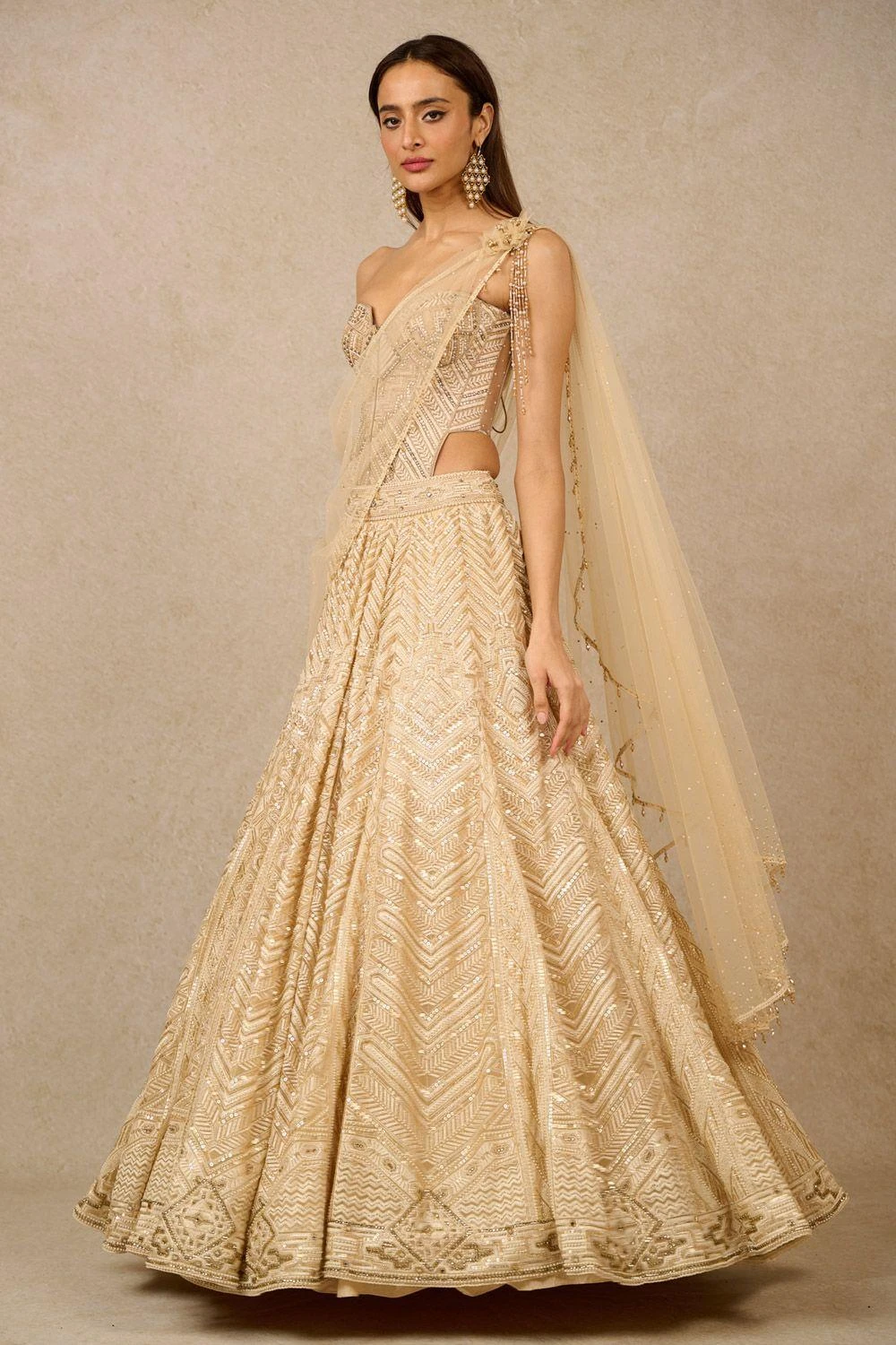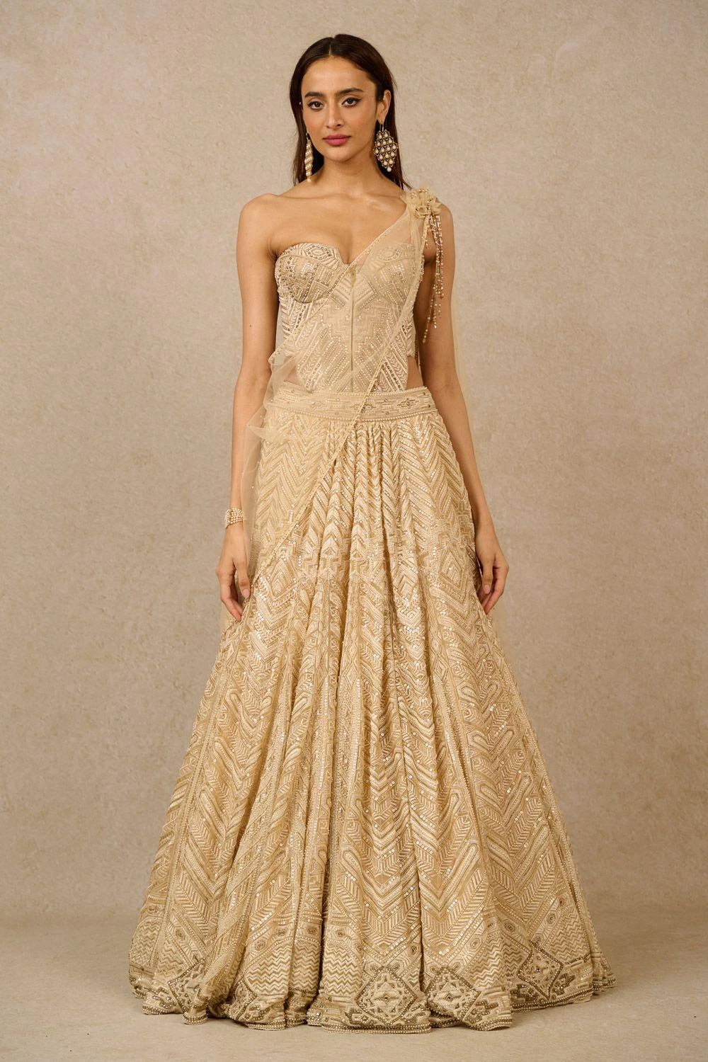 Adorned with exquisite Art Deco panels, this embroidered lehenga is a masterpiece. The sequins and cutdana work add a touch of opulence. Paired with a complementary embroidered corset for a glamorous ensemble.