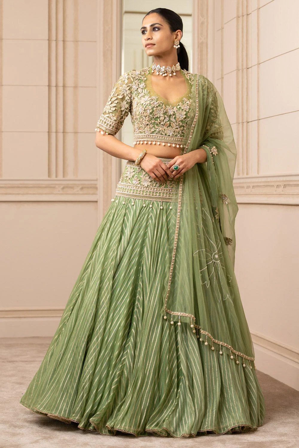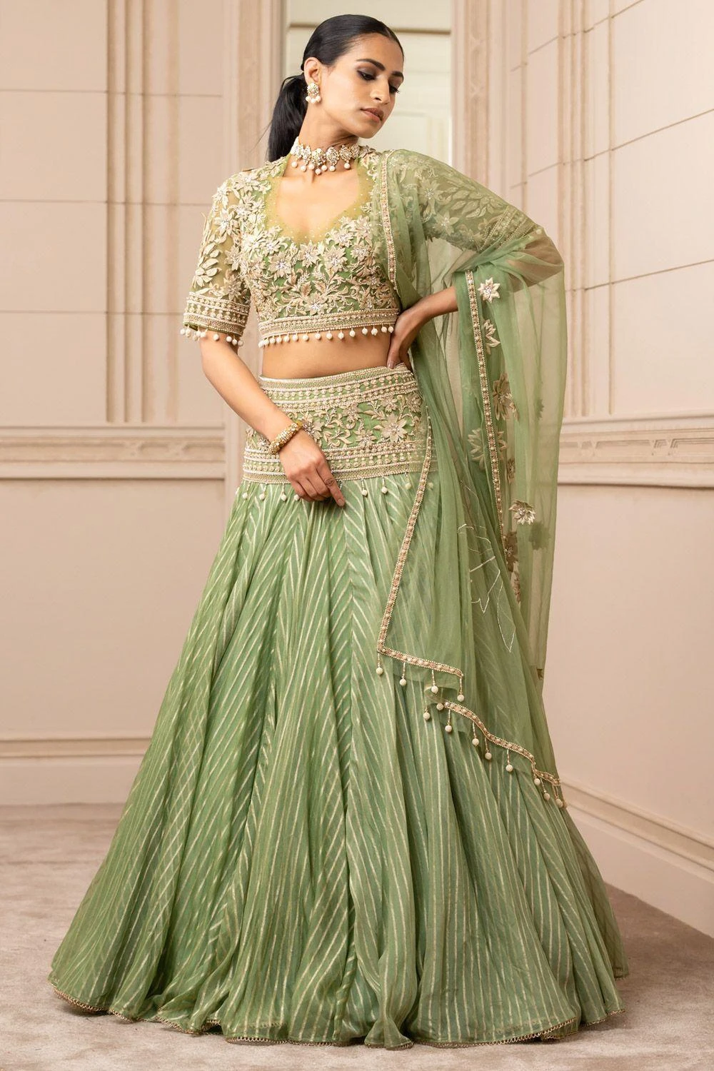 Radiate absolute splendour at your engagement ceremony in this green kalidar lehenga set. The brocade lehenga is uplifted with intricate resham embroidery on the hipyoke. It is paired with a matching embroidered sheer blouse & tulle dupatta.