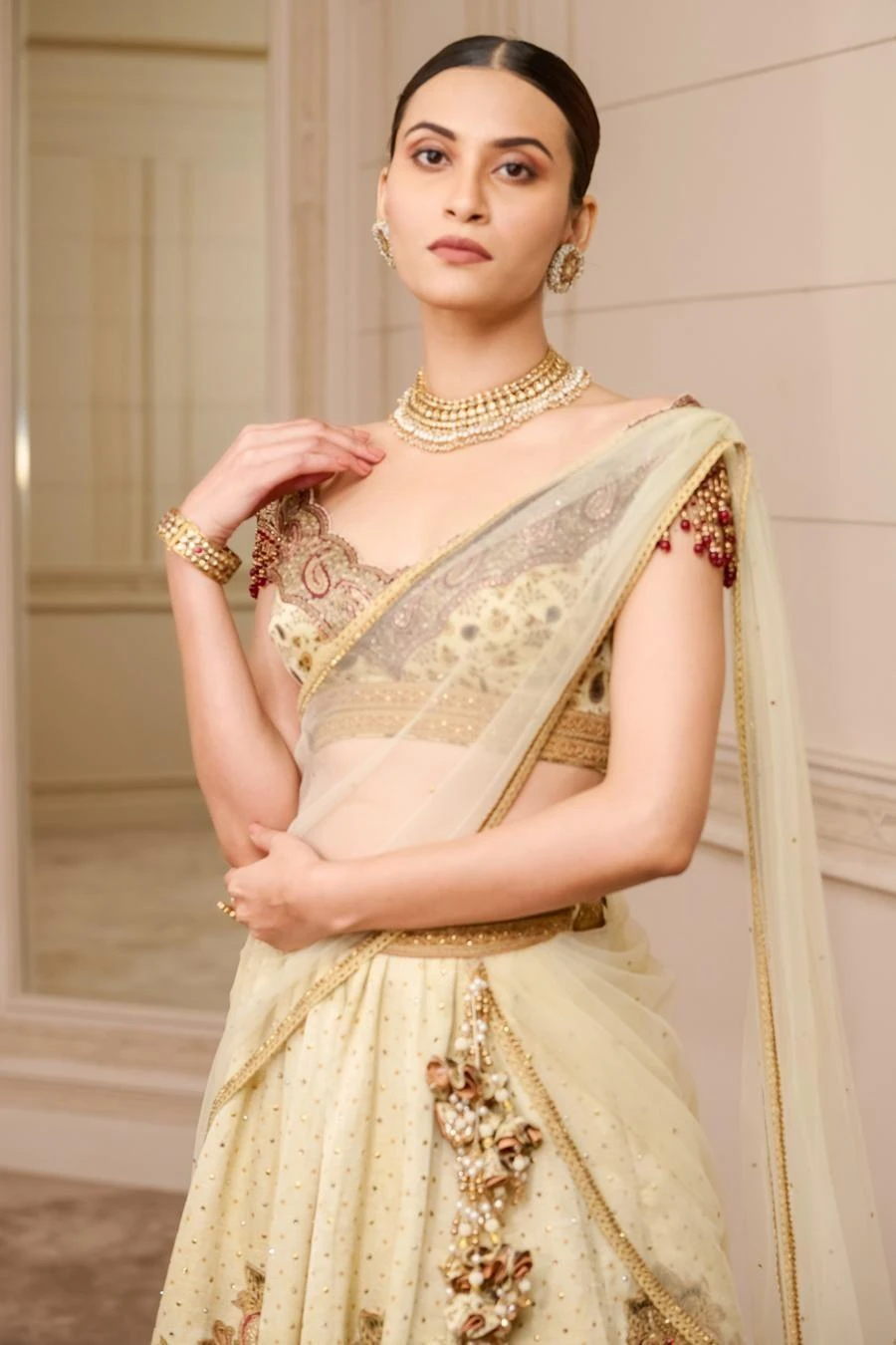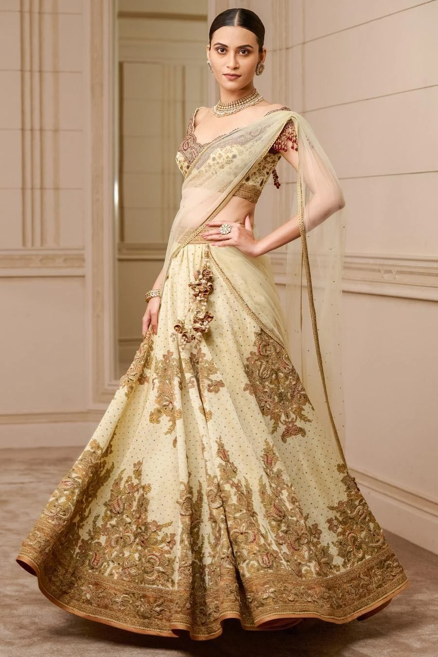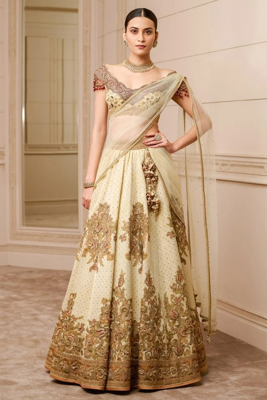 This printed kalidar lehenga in kasab-satin fabric is to be worn with a matching blouse with a scalloped neckline, detailed with crystal fringes. A printed drape that goes across the chest adds to the drama of the ensemble.
