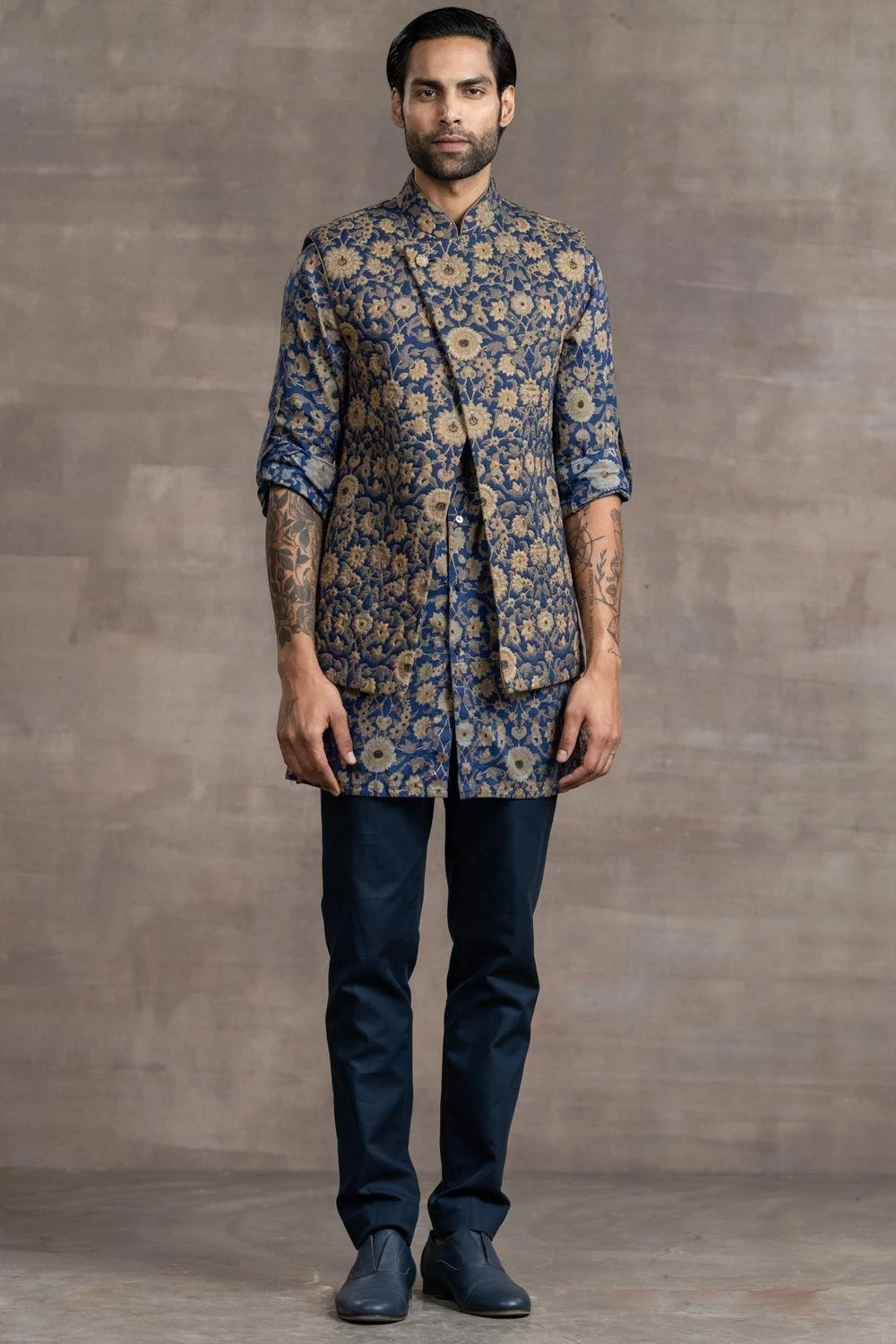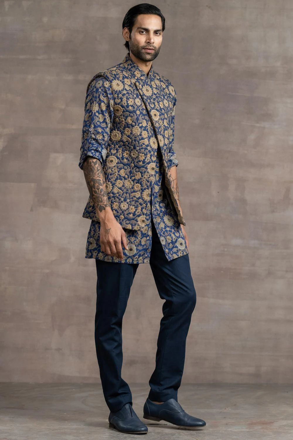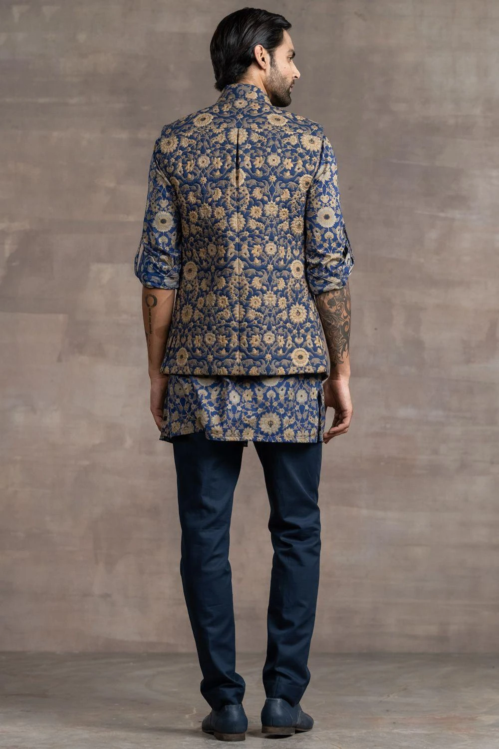 This jacket set will see you through all kinds of celebrations this upcoming wedding season. This set comes with a floral printed, asymmetrical quilted bundi paired with a kurta and trousers. Style this set with a shawl to complete the look.