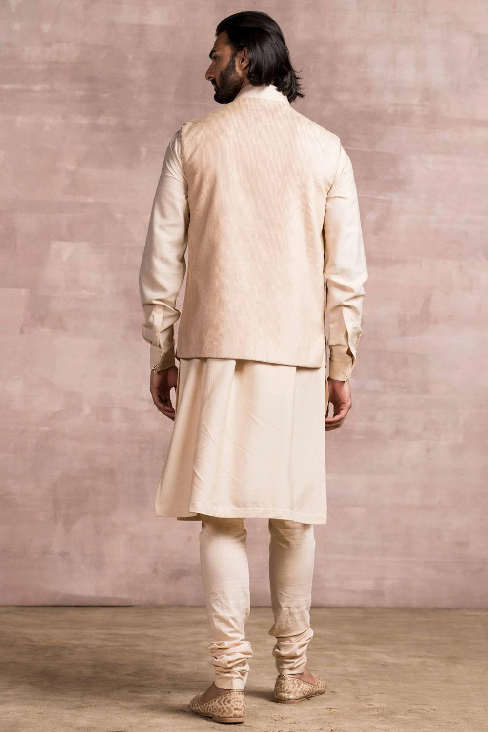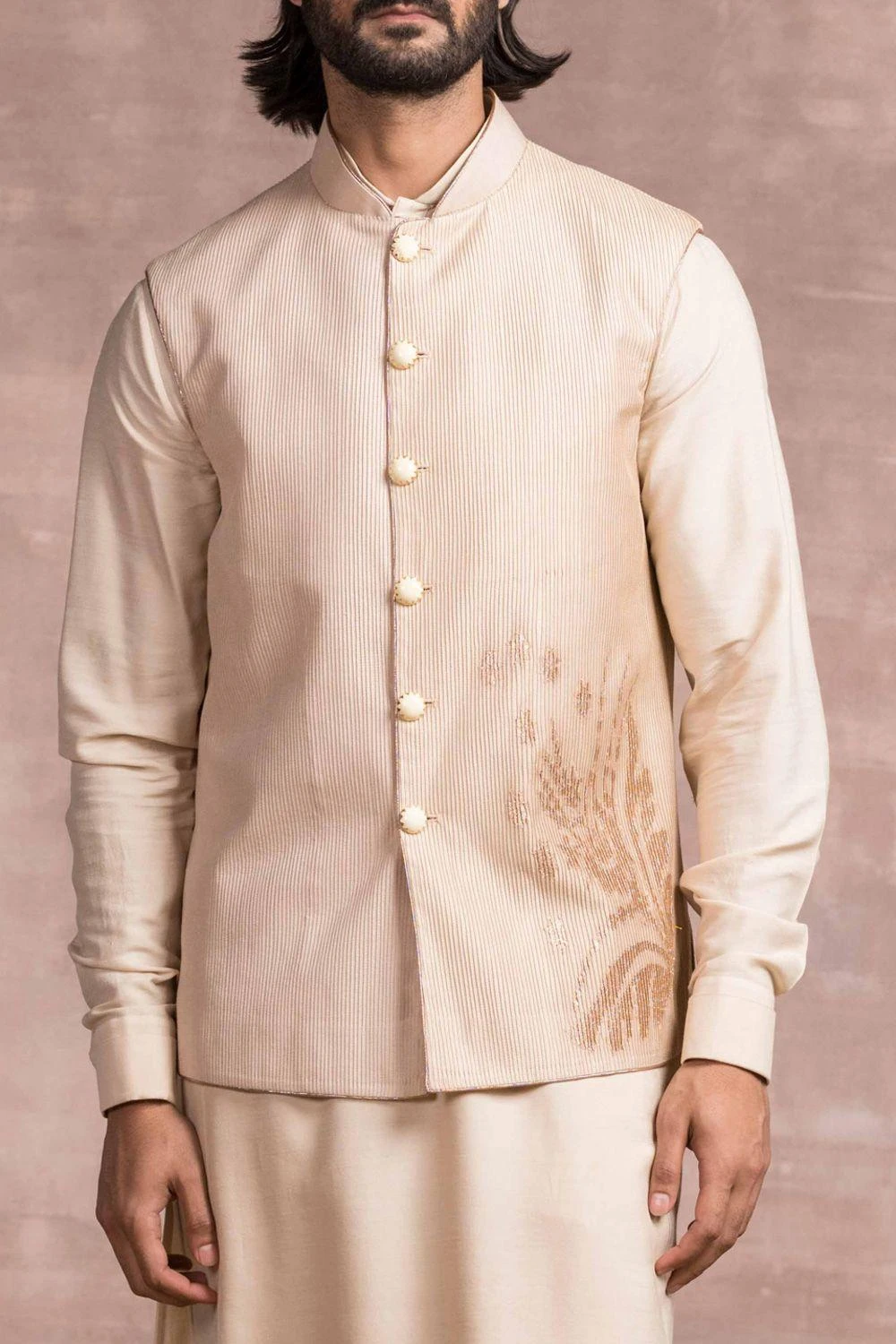 This light gold bundi jacket is crafted in spun silk fabric with all over texturing and enhanced with a gota applique motif in the side. You can style it with a coordinating ivory kurta set from the collection.