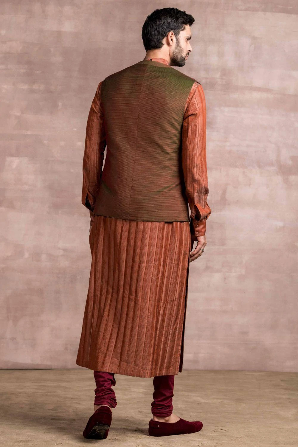 This metallic sleeveless bundi jacket adds the perfect amount of glamour to your festive looks. It is cut in spun silk fabric with all over texture detailing. You can style it with a coordinating rust kurta set.