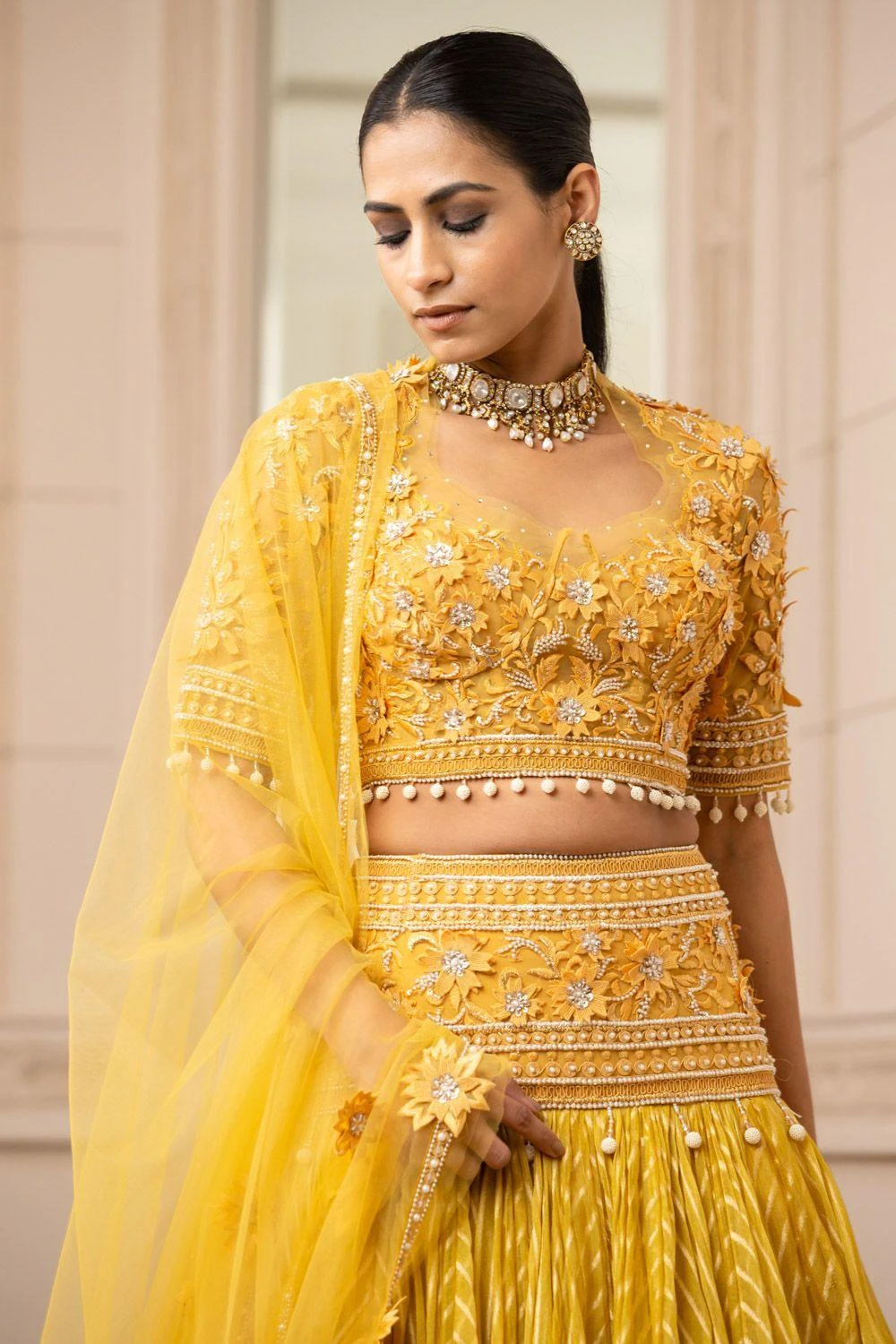 Radiate absolute splendour at your engagement ceremony in this mustard kalidar lehenga set. The brocade lehenga is uplifted with intricate resham embroidery on the hipyoke. It is paired with a matching embroidered sheer blouse & tulle dupatta.
