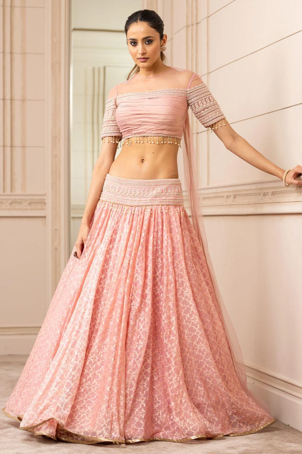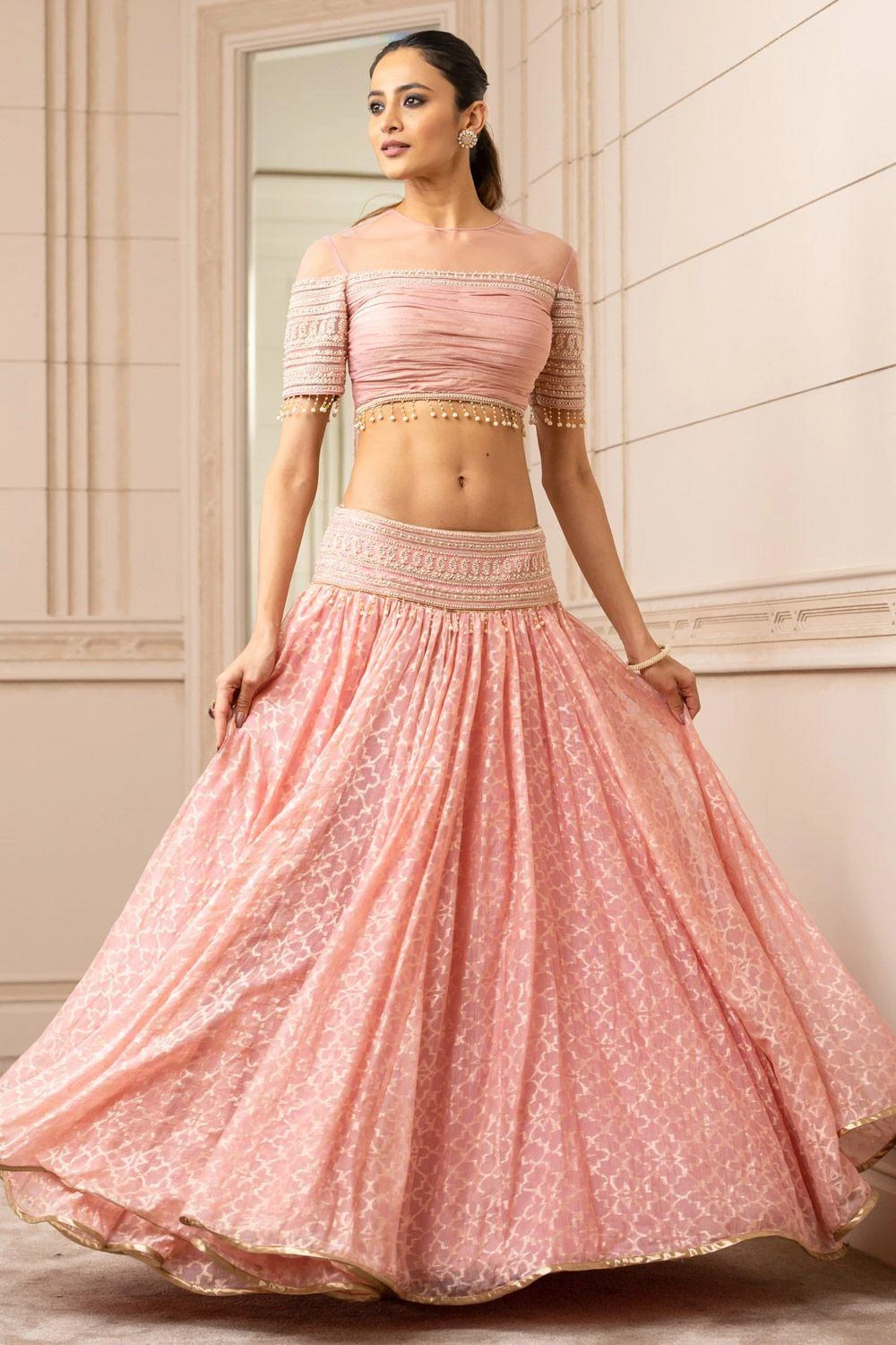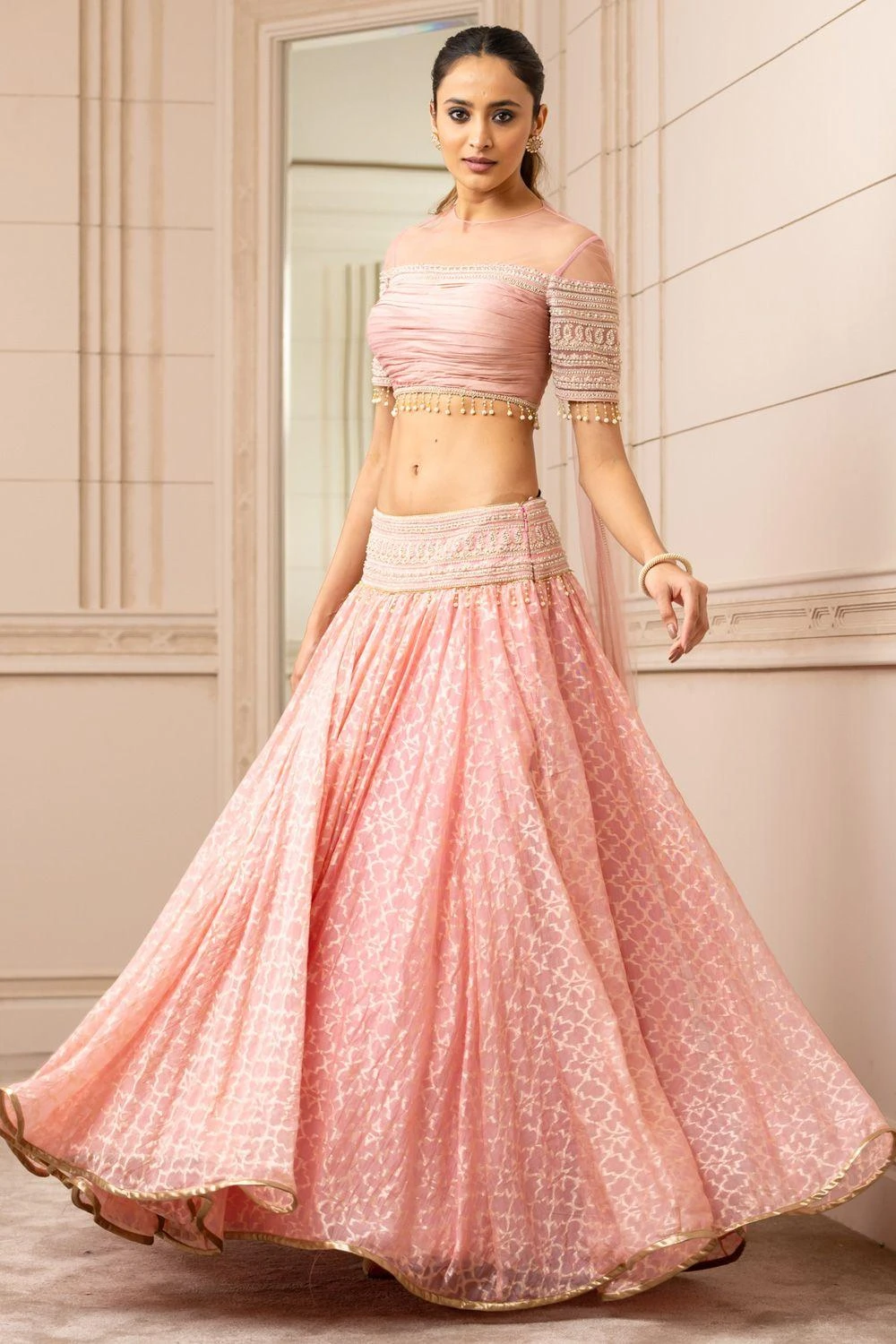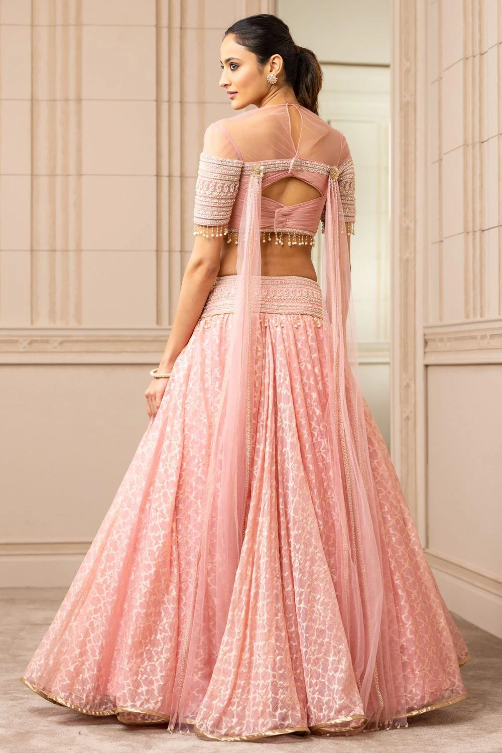 Give a modern update to your bridal trousseau with this pink handloom lehenga set. It features a draped kalidar hipyoke lehenga, paired with a matching fluted sheer blouse detailed with embellishments & fringe tulle wings.