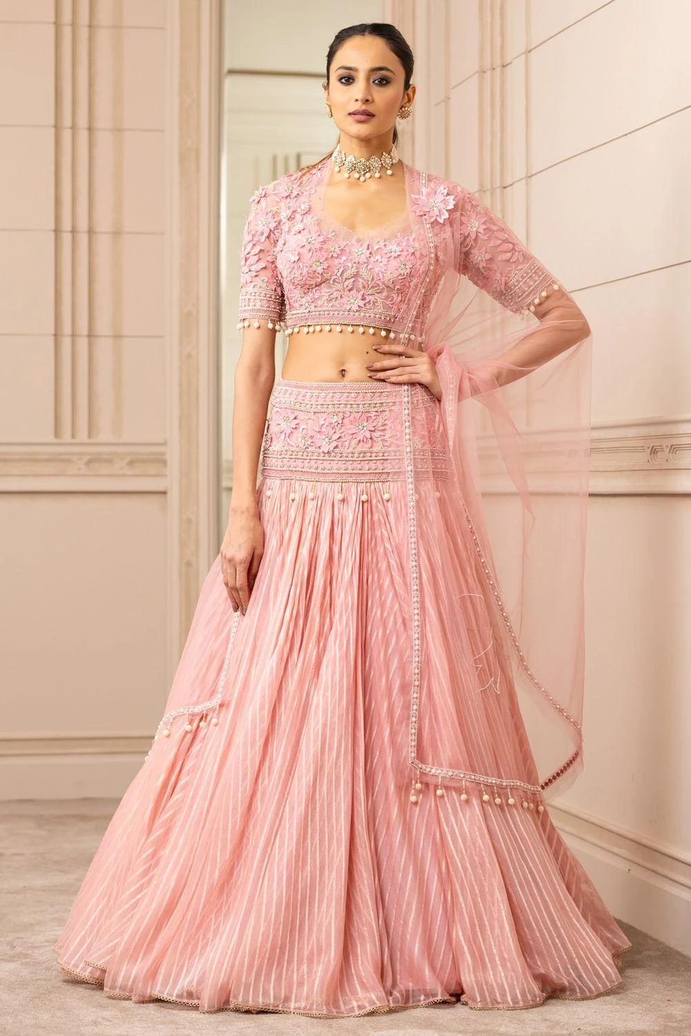 Radiate absolute splendour at your engagement ceremony in this pink kalidar lehenga set. The brocade lehenga is uplifted with intricate resham embroidery on the hipyoke. It is paired with a matching embroidered sheer blouse & tulle dupatta.