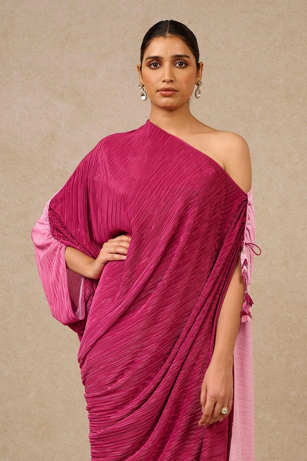 Drape yourself in elegance with this asymmetric off-shoulder kaftan. Crafted from oyster-hued crinkled fabric, it features exquisite gathering at the lower waist and sleeves, adorned with charming tassels for a touch of sophistication.