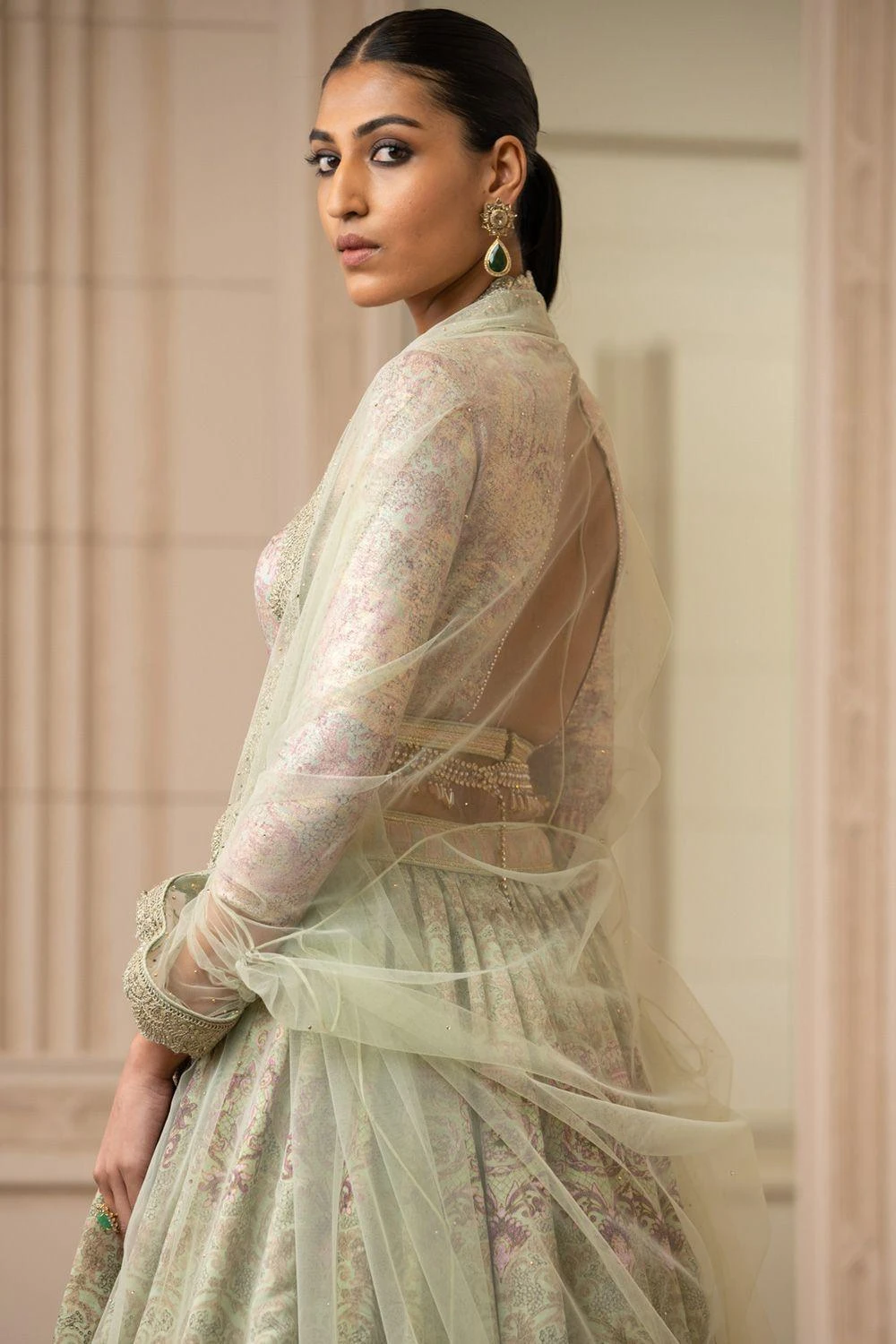 Tarun Tahiliani’s dreamy rendition of a lehenga is pure magic. It is designed in printed kasab satin fabric with a light embroidered waistband. It is offset with a matching printed embellished blouse & a tulle cape with lace border.