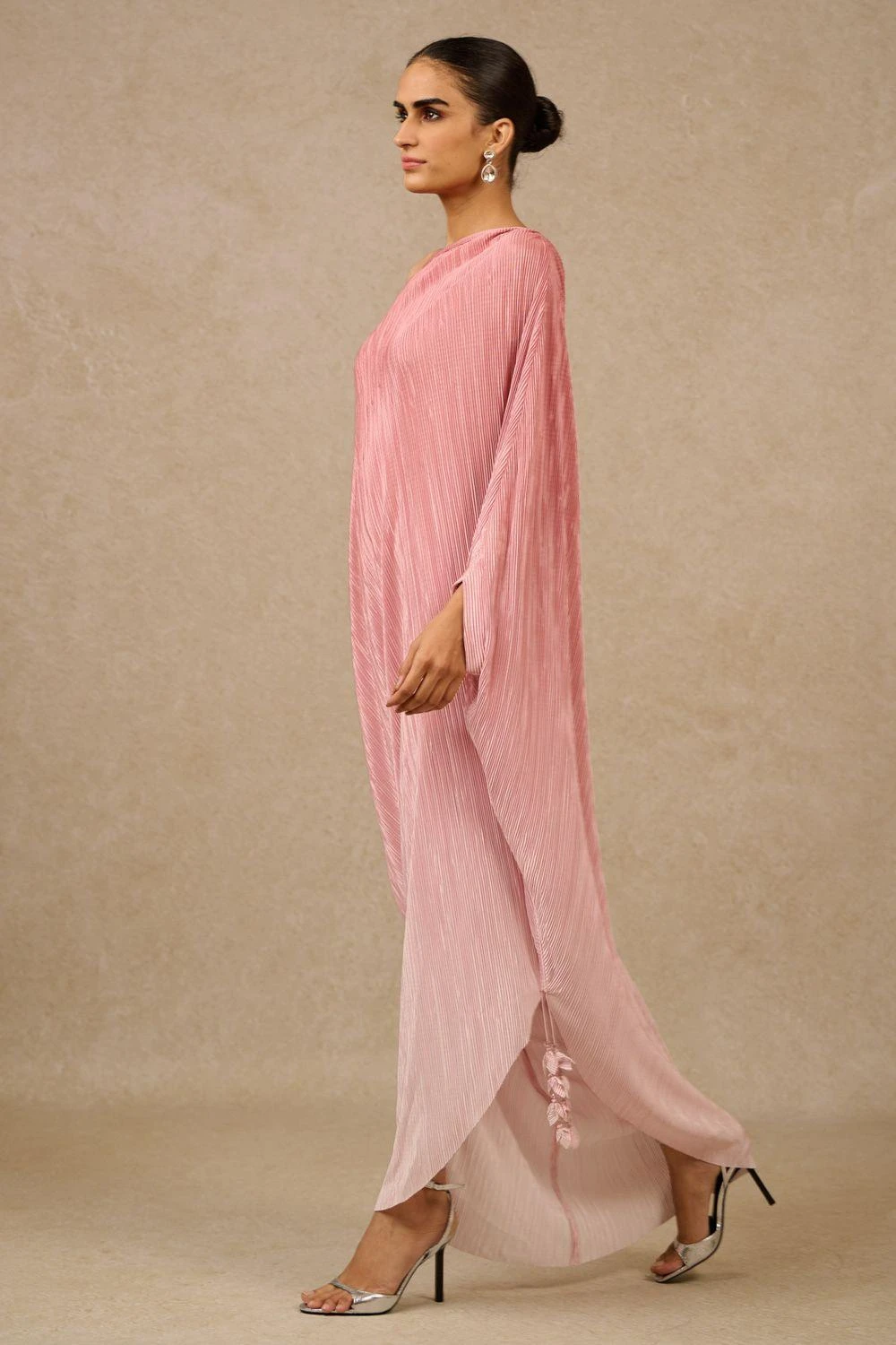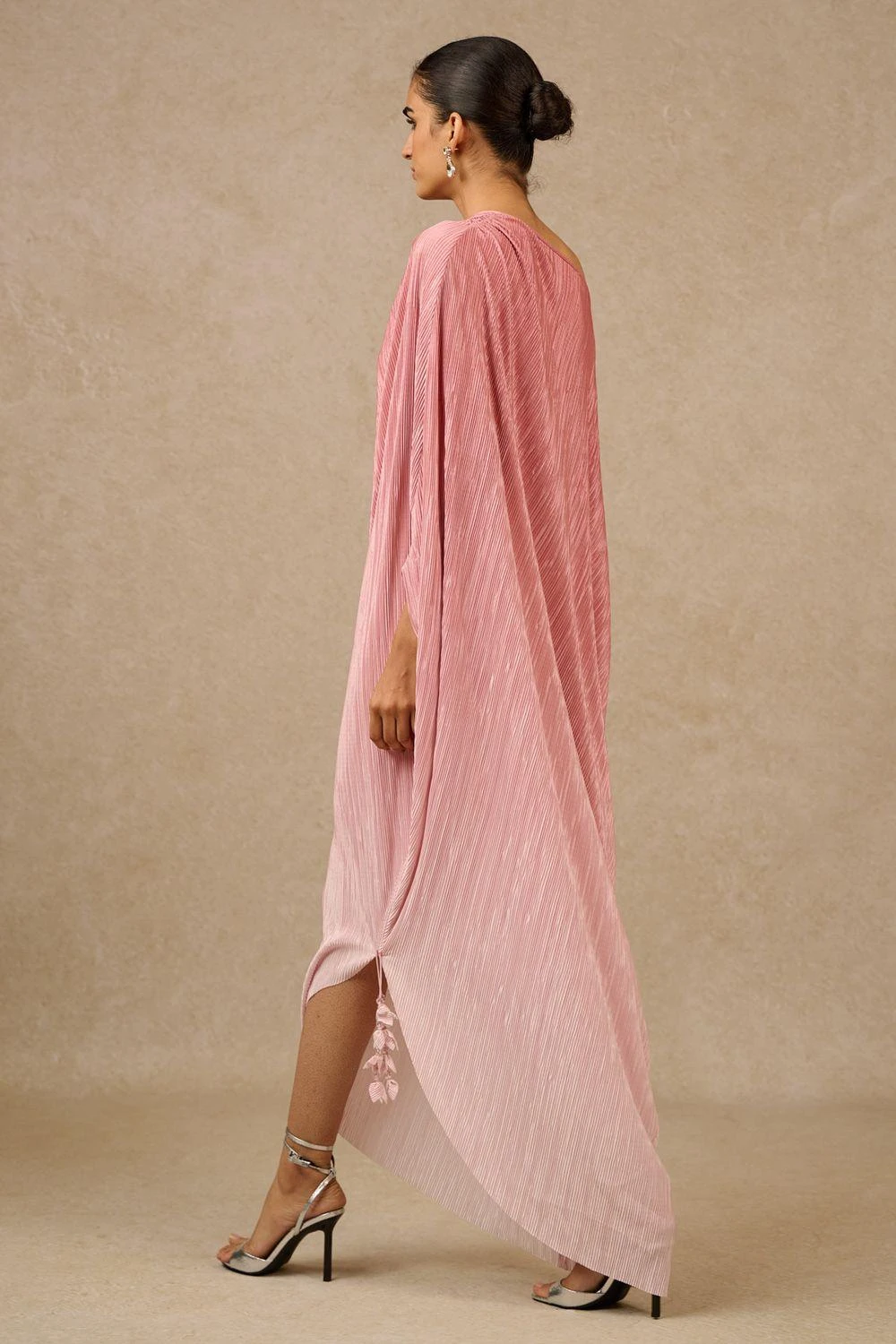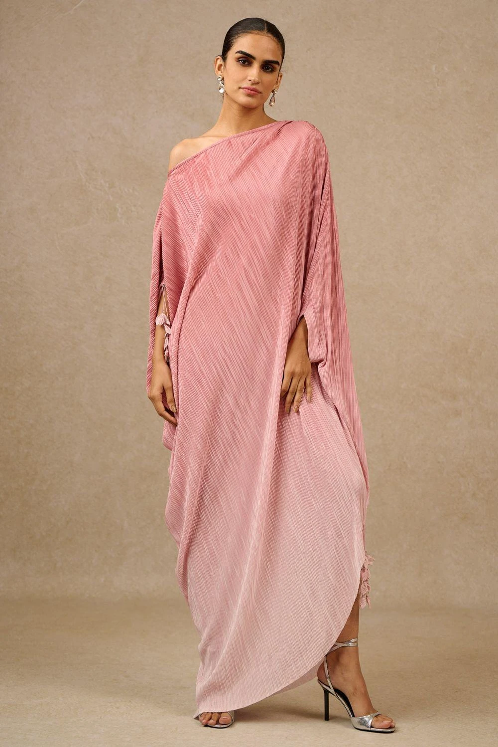 Elevate your style with this asymmetrical off-shoulder kaftan. Crafted in exquisite ombre crinkled fabric, it features subtle gathered details on the shoulders and charming tassels on both sides for a touch of chic sophistication.