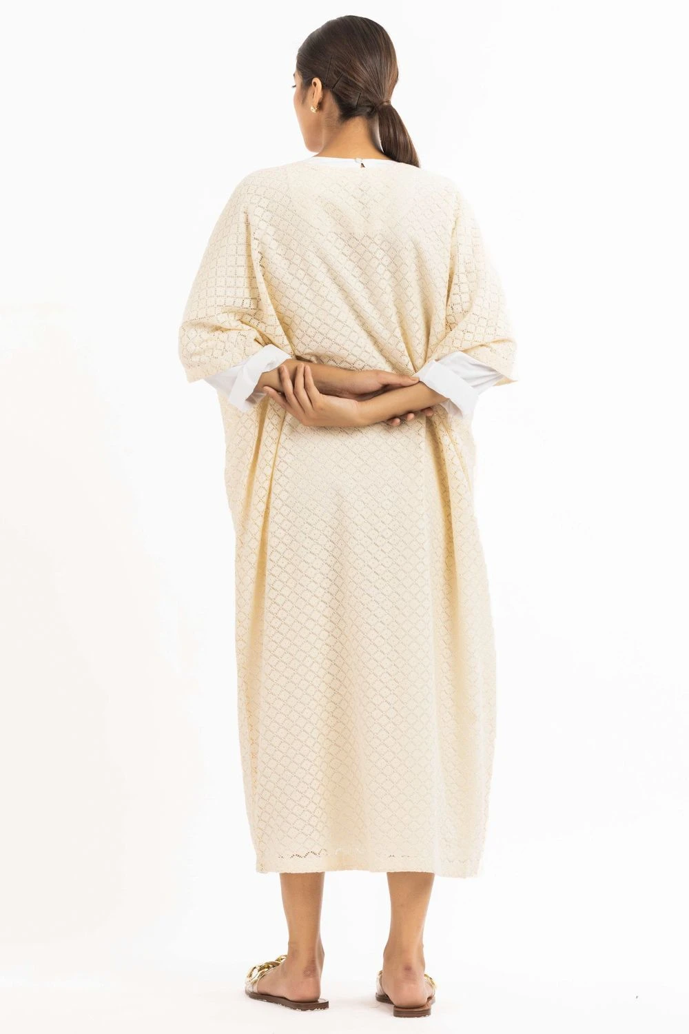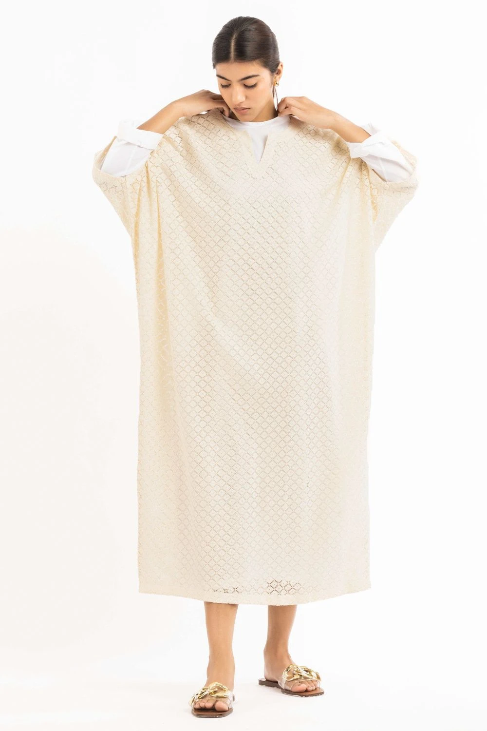 On duty or off duty, this cream kaftan is a great pick. It features an off-white lace kaftan, paired with a cotton poplin round neck tunic. You can style this effortless piece with a pair of chic hoops, for an elevated look.
