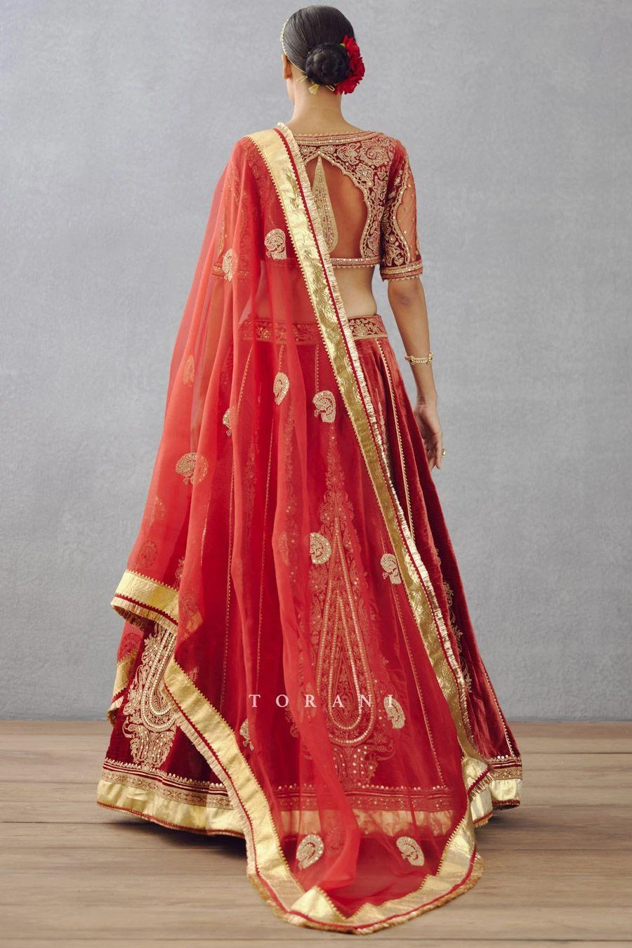 Add this ethereal ensemble to your wedding trousseau for an elegant engagement look. Crafted in silk velvet, this set features a gota embroidered with golden thread work lehenga with a jaal embroidered blouse & dupatta.