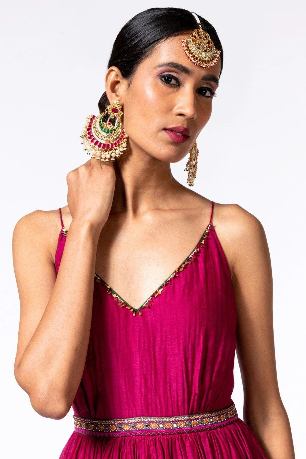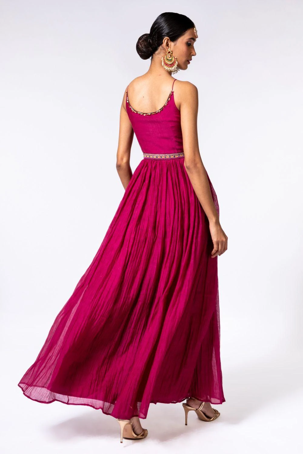 This ruby red maxi dress is set in 100% cotton silk. It is cut in a fit & flare silhouette with a cinched waist detail. Style this piece with the matching jacket for daytime festivities.