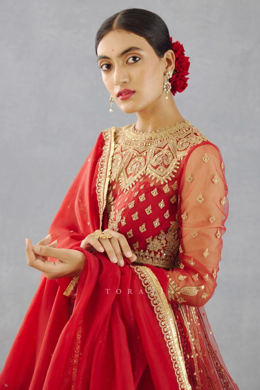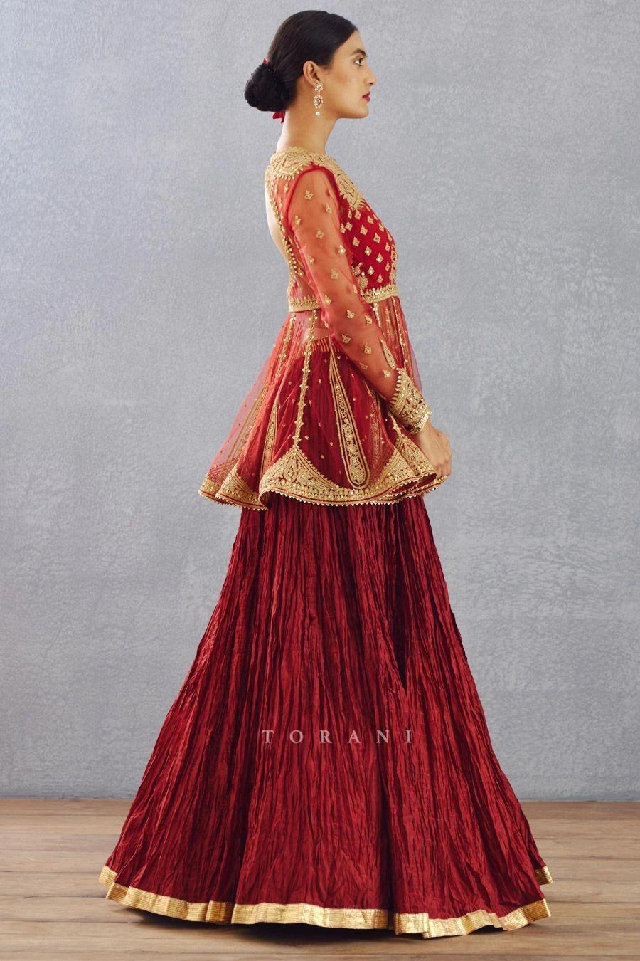 Add this ethereal ensemble to your wedding trousseau for an elegant engagement look. This set features a bright red crushed lehenga in a handwoven chanderi with a hand embroidered sheer kurta style blouse & a sheer dupatta.