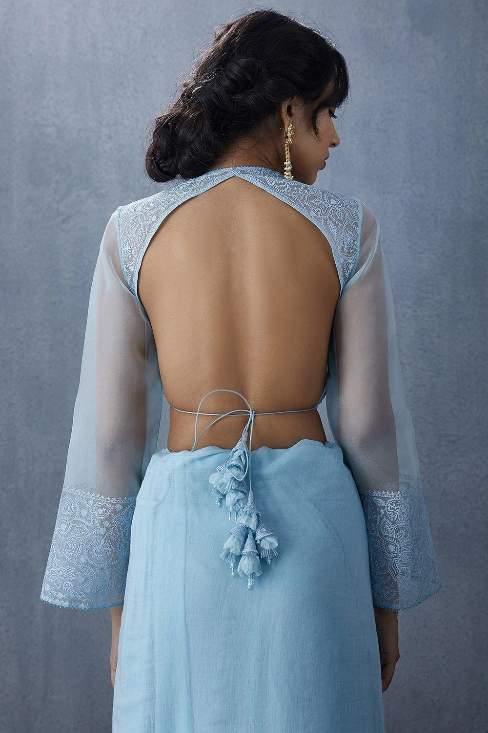 This sky blue blouse is unique for its contemporary take with traditional embroidery. Wear it with flared palazzos & long tassel earrings for a sangeet night or pair it with an organza sari for a reception.
