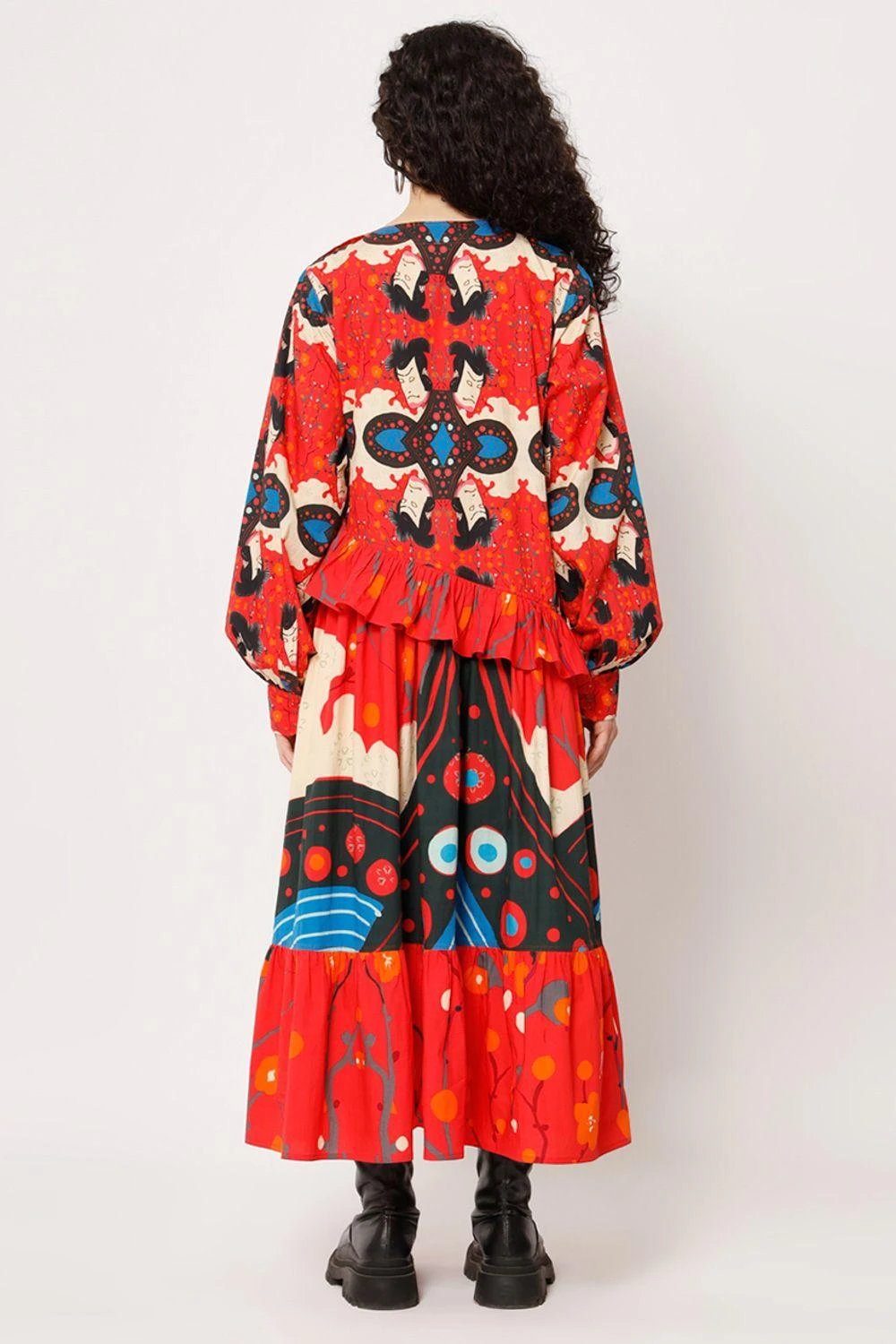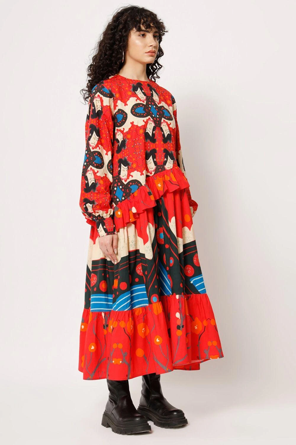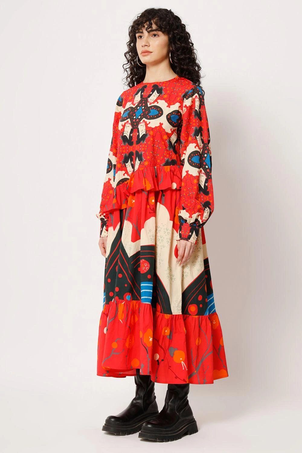 Indulge in the elegance of this A-line dress featuring asymmetrical frill details on the waist and hem. The digital print showcases the captivating samurai warrior design, adding a touch of mystique.