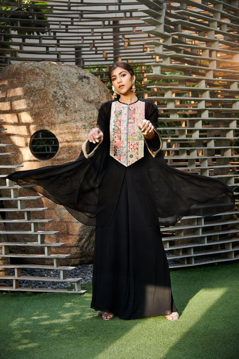 This sharara set will see you through all kinds of pre wedding festivities. It features a black georgette zipper tunic enhanced with intricate patchwork and lace, paired with a sharara. Style this set with a potli bag to complete the look.