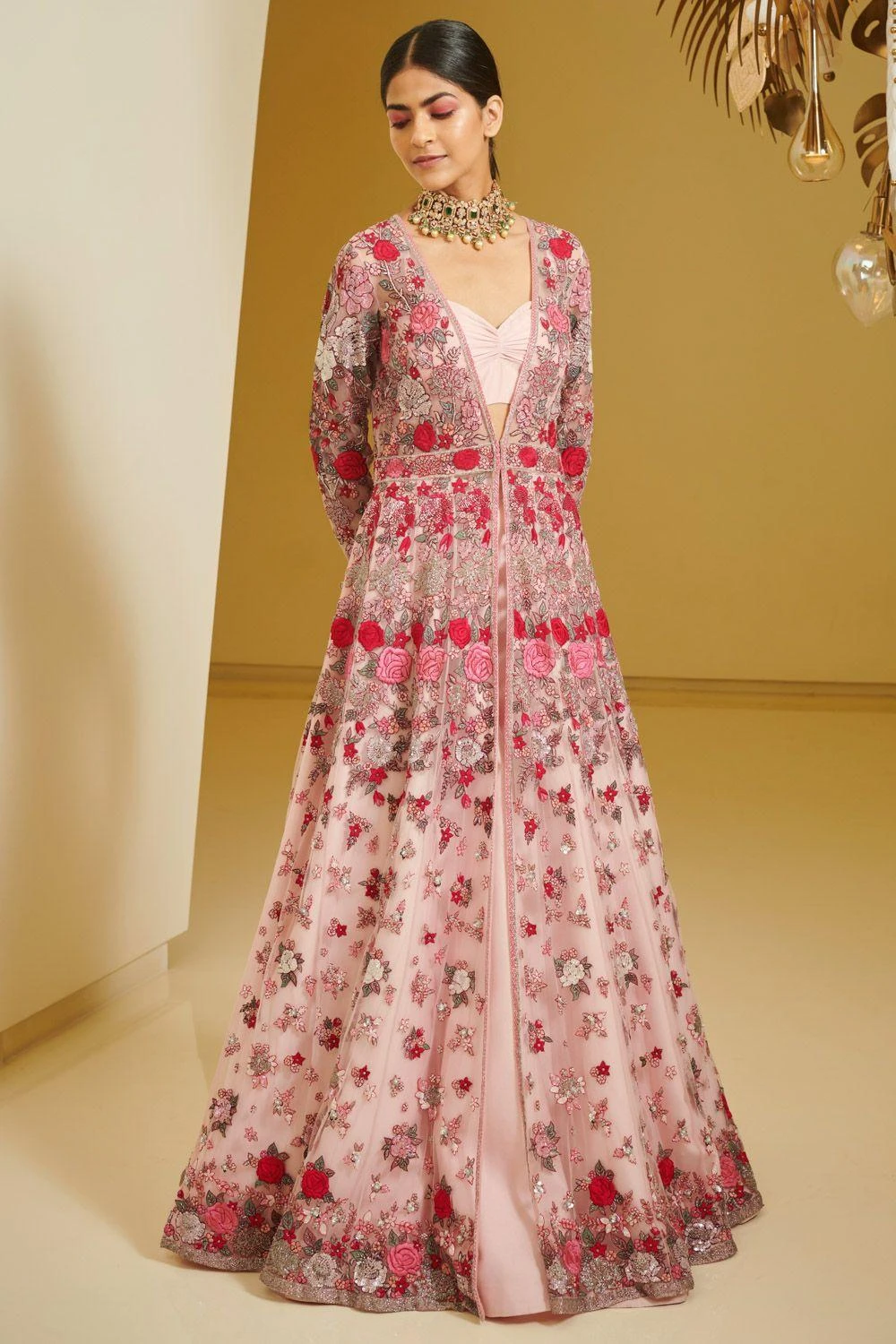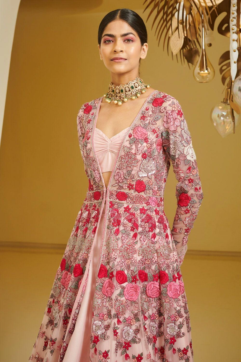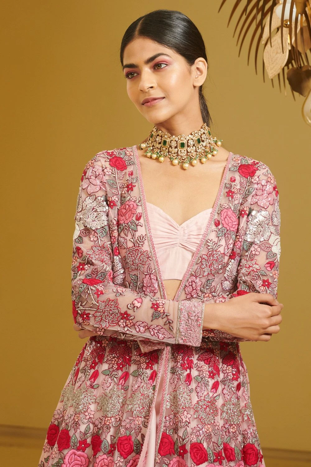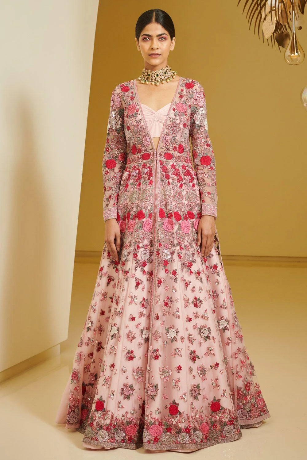 This lehenga & jacket set is elegant & timeless. This piece is perfect for summer weddings festivities. The set is embroidered using resham thread embroidery & is embellished with pearl, sequins & cutdana details.